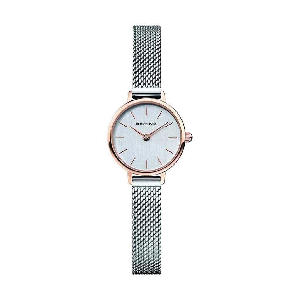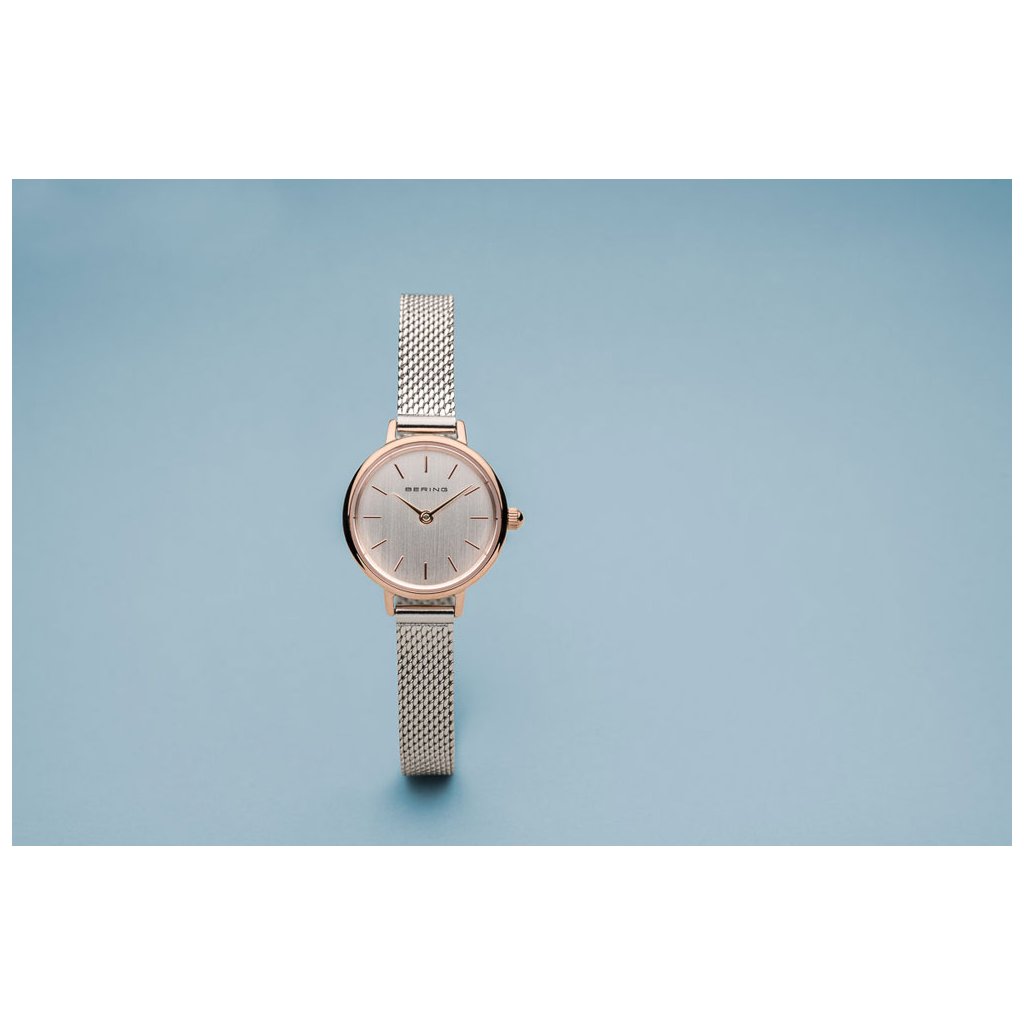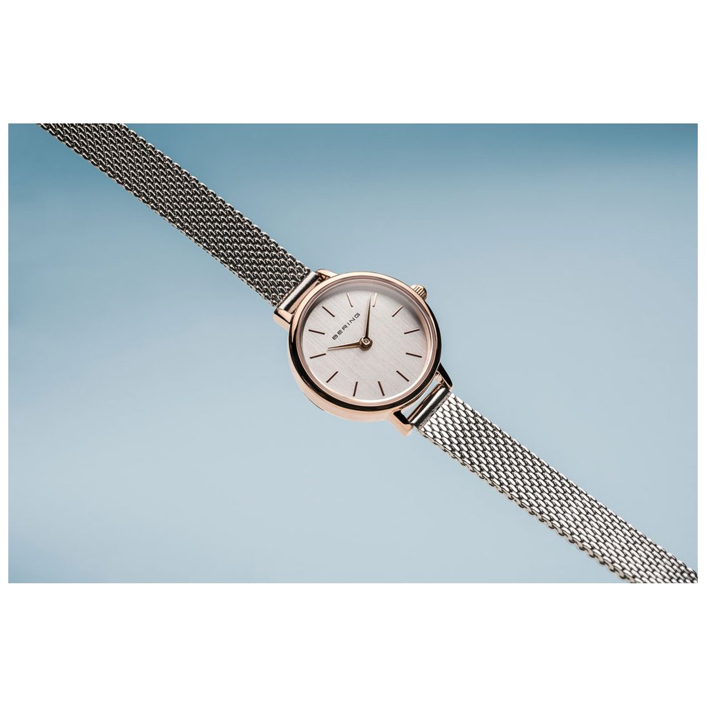 Drobné dámské hodinky Bering Classic 11022-064. Minimalistické hodinky se safírovým sklíčkem odolným proti poškrábání z vysoce kvalitní nerezové oceli. Hodinky rozhodně zaujmou svým elegantním vzhledem. Hodinky drží na ruce díky pletenému náramku z ušlechtilé oceli. Vodotěsnost tohoto modelu je 3ATM, hodinky tedy lze vystavit mytí rukou a sprchování. Svým průměrem 22 mm se řadí mezi drobné dámské hodinky.