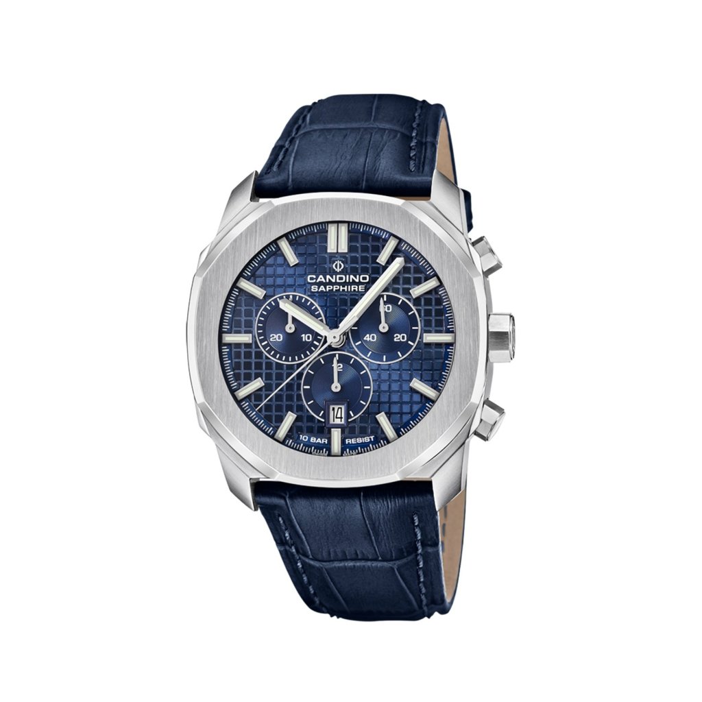 Pánské quartzové hodinky disponující funkcí stopek, datumovkou a vodotěsností 100 metrů. Modrý číselník je chráněn safírovým sklem a hranatým ocelovým pouzdrem, na které plynule navazuje kožený řemínek.