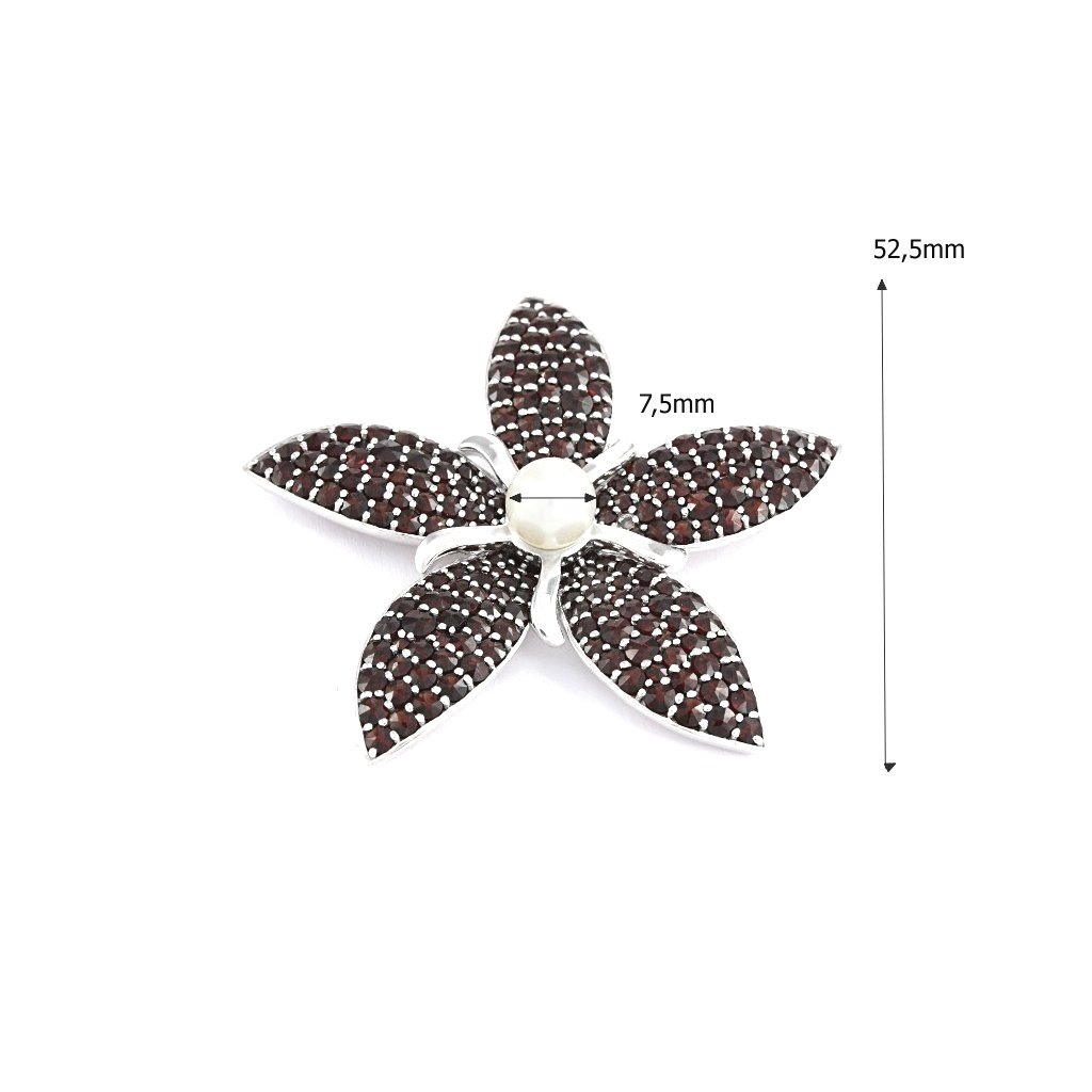 Elegantní náhrdelník Český granát je vyroben z rhodiovaného stříbra ve tvaru květiny s perličkou uprostřed. Koncové zapínání je s pérovým kroužkem v délce 42cm. Doporučujeme Vám náušnice 6371272 do soupravy. Jeho nositelka jej využije jako nepřehlédnutelnou brož.