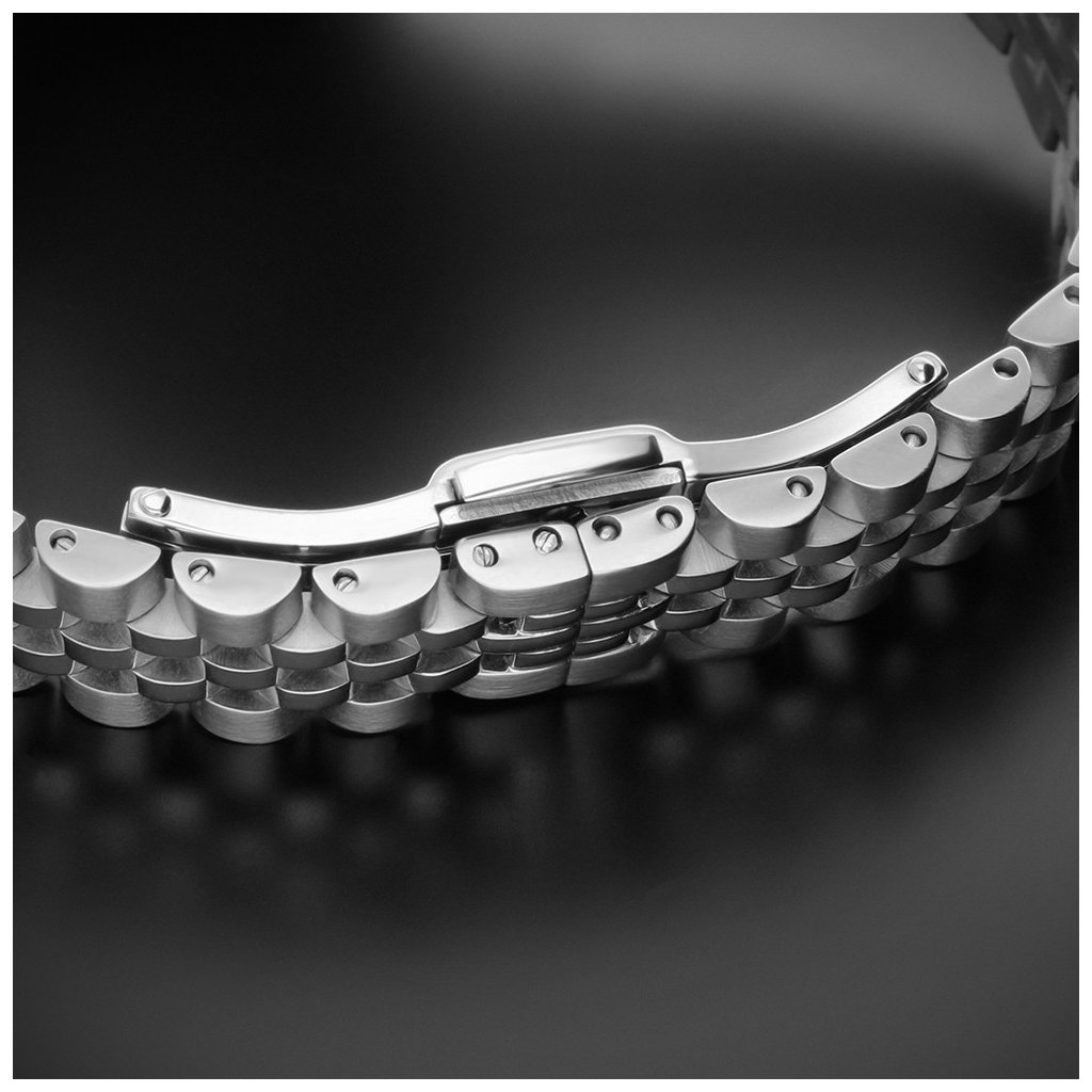 Dámy zaujme texturovaný perleťový číselník s fasovanými indexy na pozici 12, 3, 6 a 9. Safírové sklo s antitouch a antireflexní vrstvou je u tohoto dámského modelu samozřejmostí. Vybrat si můžete z mnoha barevných provedení s populárním jubilee tahem nebo koženým řemínkem s uchycením "quick release" systémem pro snadné vyměnění řemínku.