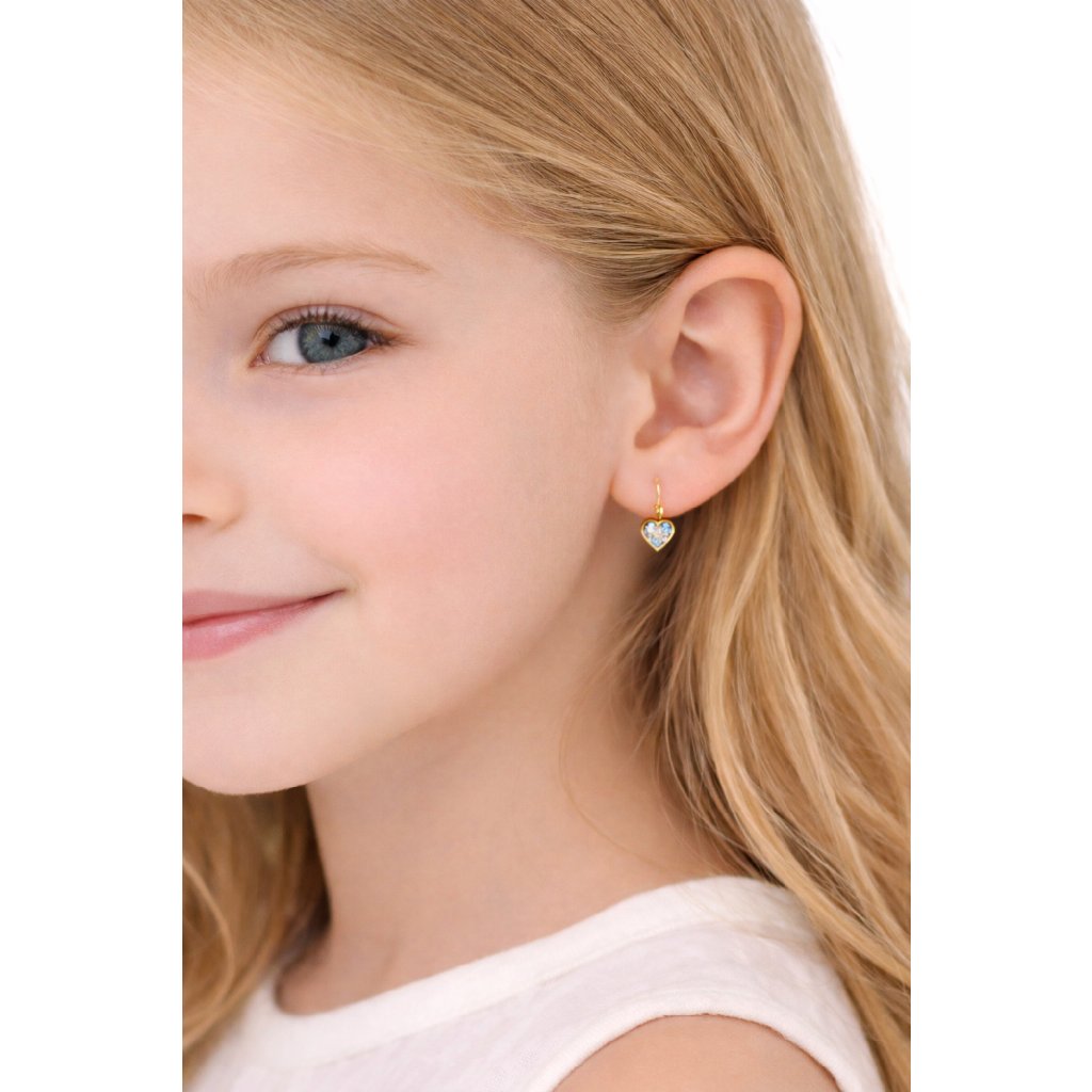 Dětské zlaté náušnice „Srdíčka světle modré“ zaujmou hravým designem s jemně modrými kamínky, které dodávají šperkům veselý a něžný vzhled.