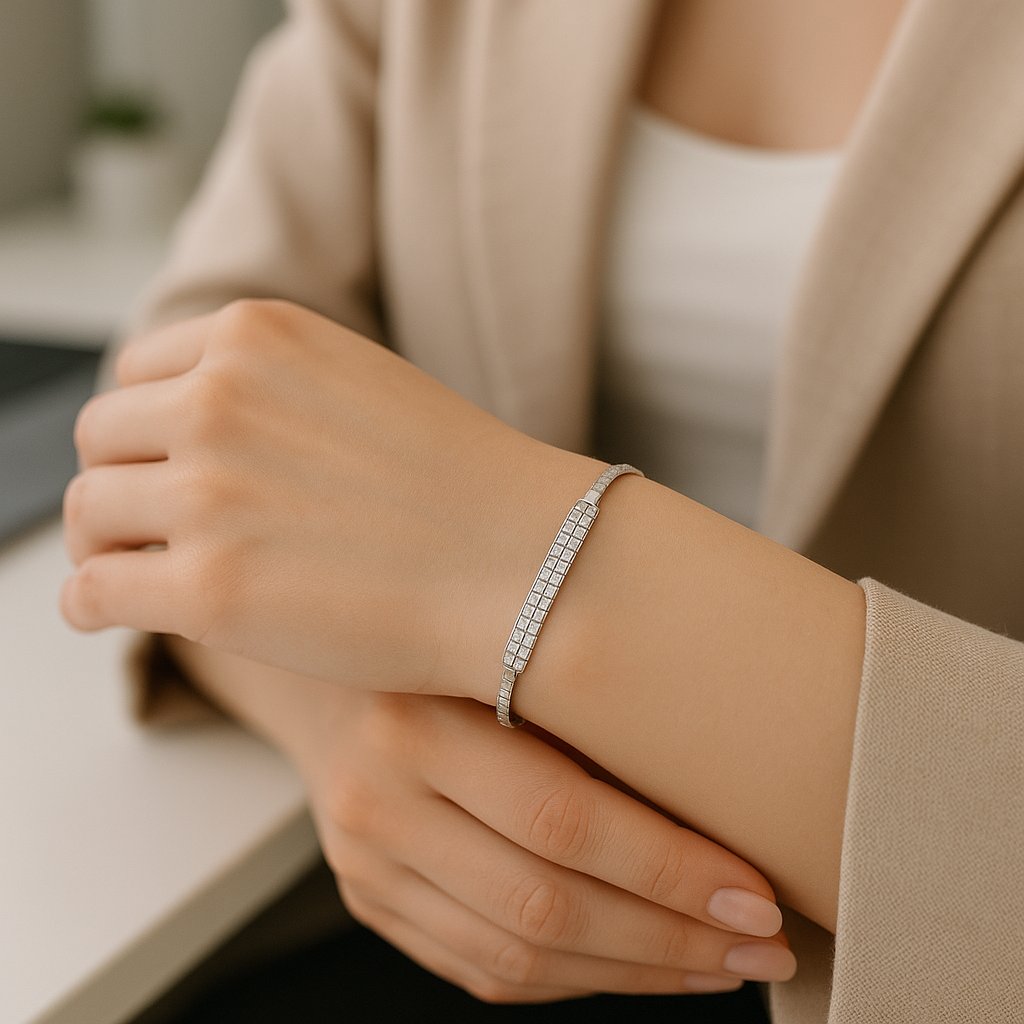 Dvě řady diamantů vedle sebe vytvářejí bohatší vizuální dojem oproti jednotné linii — svým vzhledem dodávají zápěstí jemnou eleganci a výraz bez přehánění.