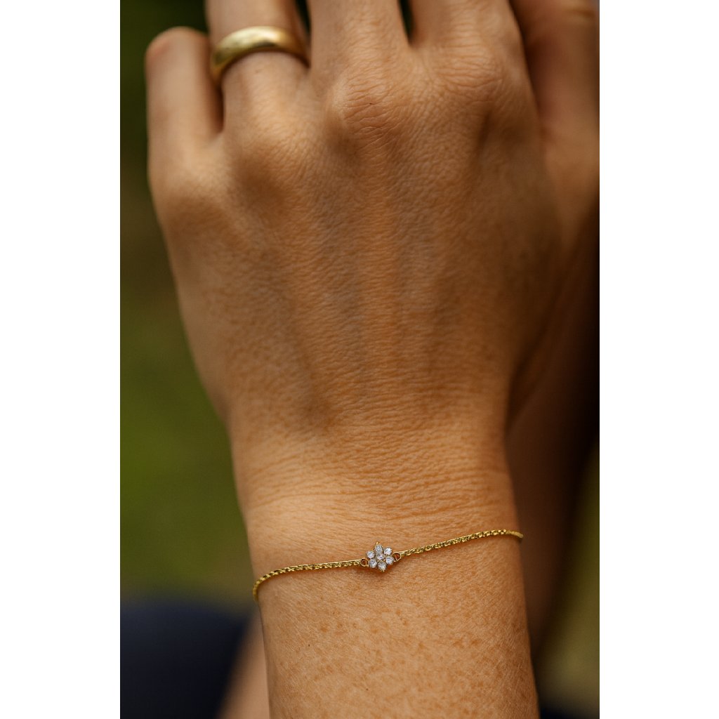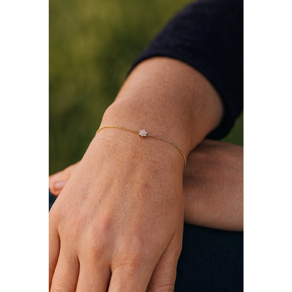 Náramek je vyroben ze žlutého zlata, které je známé svou odolností a nádherným leskem. Žluté zlato je hypoalergenní, což zajišťuje pohodlí i pro osoby s citlivou pokožkou. Náramek je zdoben diamanty o celkové hmotnosti 0.10 karátů. Diamanty jsou ceněny pro svou tvrdost a brilanci, což z nich činí nejvyhledávanější drahokamy. Precizní zpracování a zasazení diamantů zaručuje, že náramek bude zářit a vypadat skvěle po mnoho let.