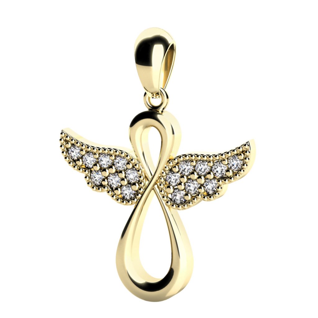 Precizně vypracovaný Anděl s jemnými diamanty zasazené ve žlutém zlatě. Anděl je symbolem víry, kterou nosíme v srdci. Součástí šperku je certifikát pravosti.