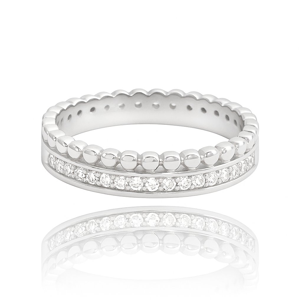 Prsten kombinuje dvě krásné struktury – spodní řadu jemně broušených zirkonů, které dodávají šperku jiskru, a horní řadu dokonale leštěných stříbrných kuliček pro moderní a sofistikovaný vzhled. Spojení těchto dvou prvků vytváří výrazný, ale stále jemný šperk vhodný pro každodenní nošení i slavnostní příležitosti.