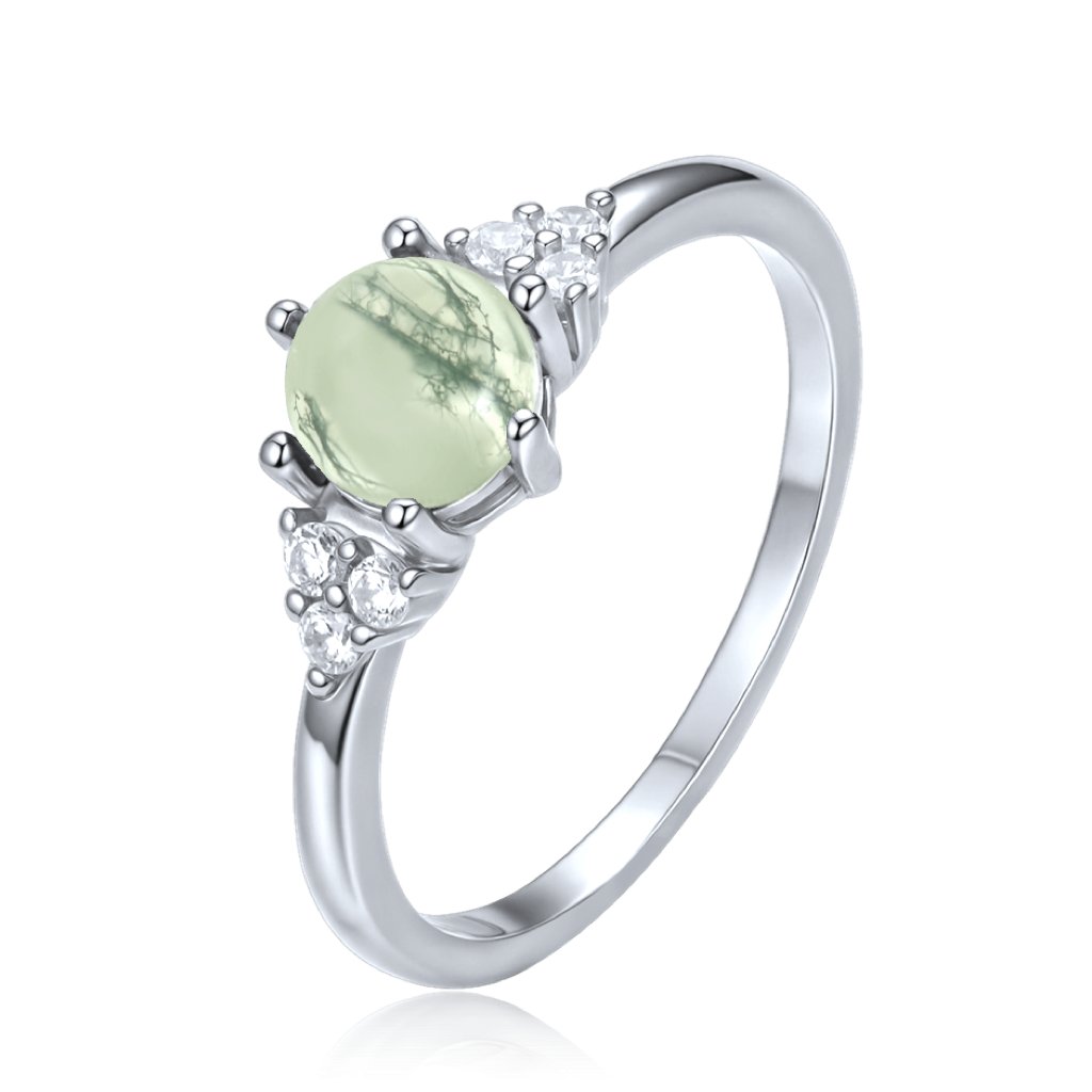 Dominantním prvkem prstenu je světlý mechový achát — přírodní kámen známý svou jedinečnou kresbou, která připomíná mechem pokryté listy či abstraktní vzory. Každý achát je originál, takže každý prsten má svou vlastní osobnost. Achát je doplněn broušeným zirkonem, který dodává šperku jasný třpyt a světelnou hru, čímž vytváří krásný kontrast mezi organickým vzhledem kamene a brilancí zirkonů.