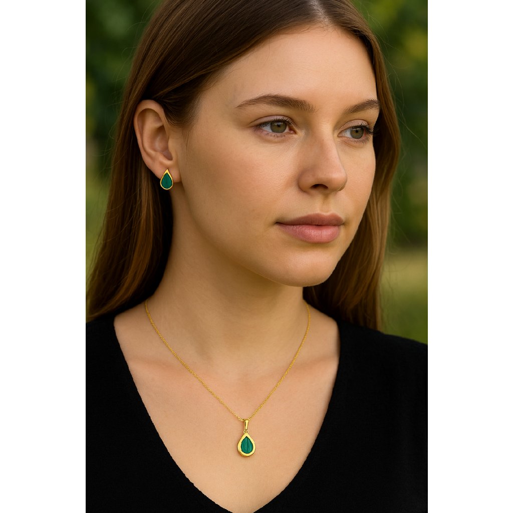 Tento elegantní zlatý náhrdelník s přívěskem v tvaru kapky je osazen výrazným zeleným malachitem, který přináší do šperku přírodní hloubku a barvu. Kapka je decentně stylizovaná — není masivní, ale vynikne v centru dekoltu.