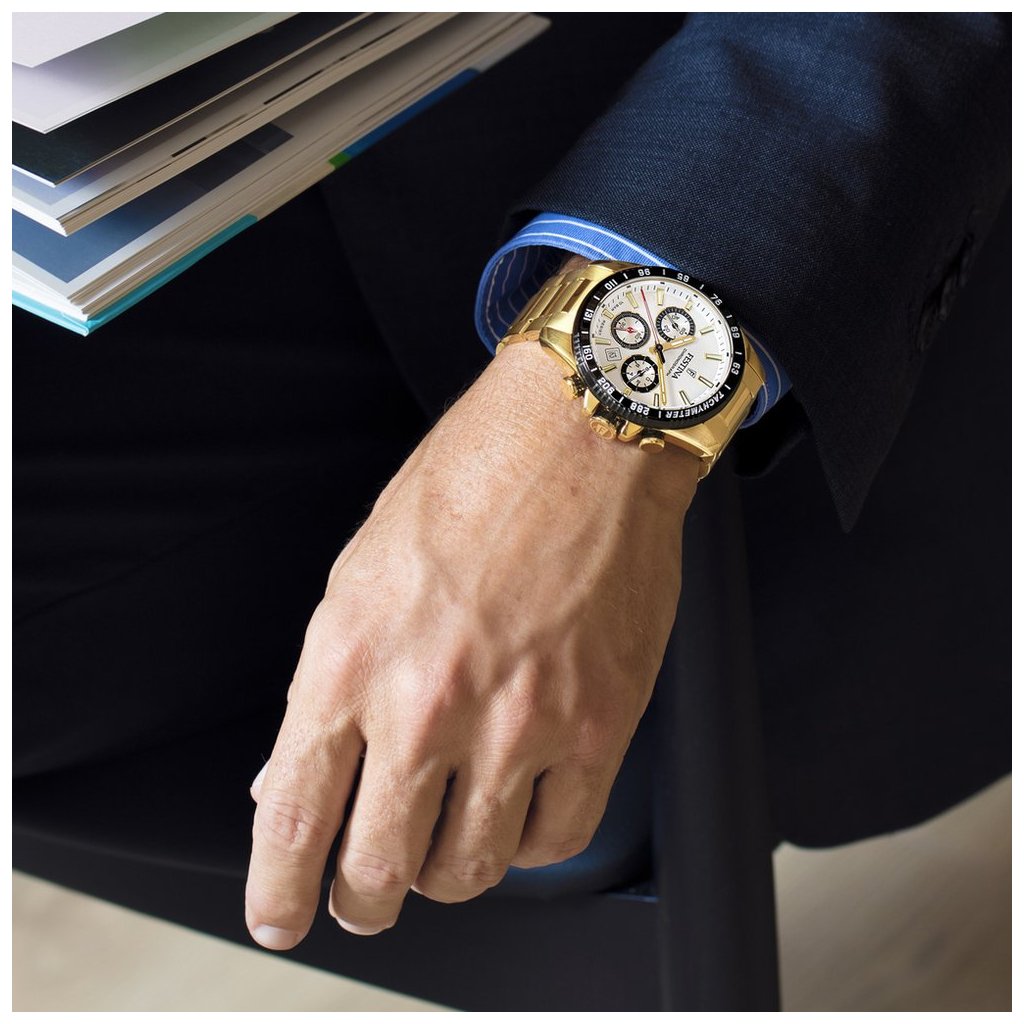 Pánské quartzové hodinky v celoocelovém provedení s PVD úpravou zlaté barvy disponují funkcí stopek, ukazatele data, tachymetrickou stupnicí na černé lunetě a vodotěsností 100 metrů. Stříbrný číselník se zlatými indexy je chráněn minerálním sklem.