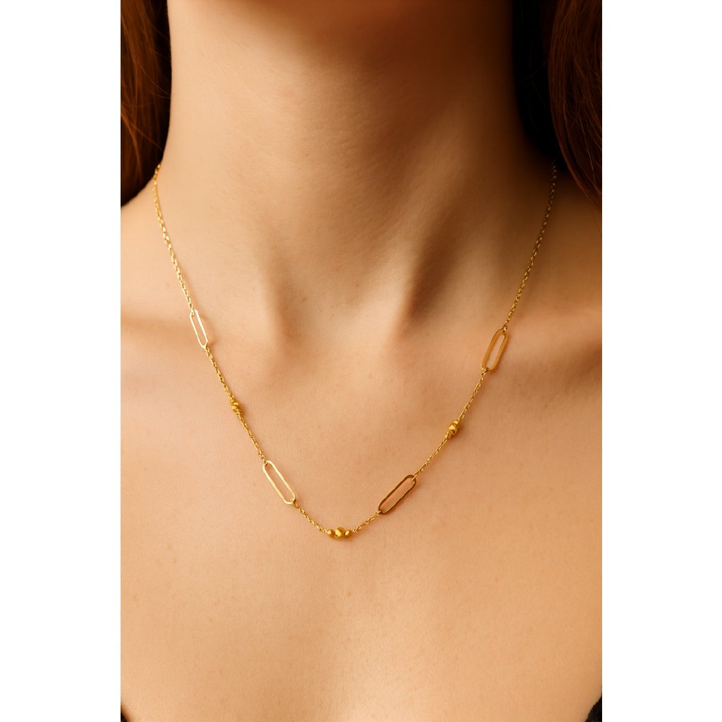 Oválné články střídající se s drobnými lesklými kuličkami vytvářejí subtilní, ale zajímavou texturu kolem krku. Náhrdelník působí lehce a vzdušně — ideální volba pro ženy, které hledají šperk, který jemně doplní outfit, aniž by působil těžkopádně.