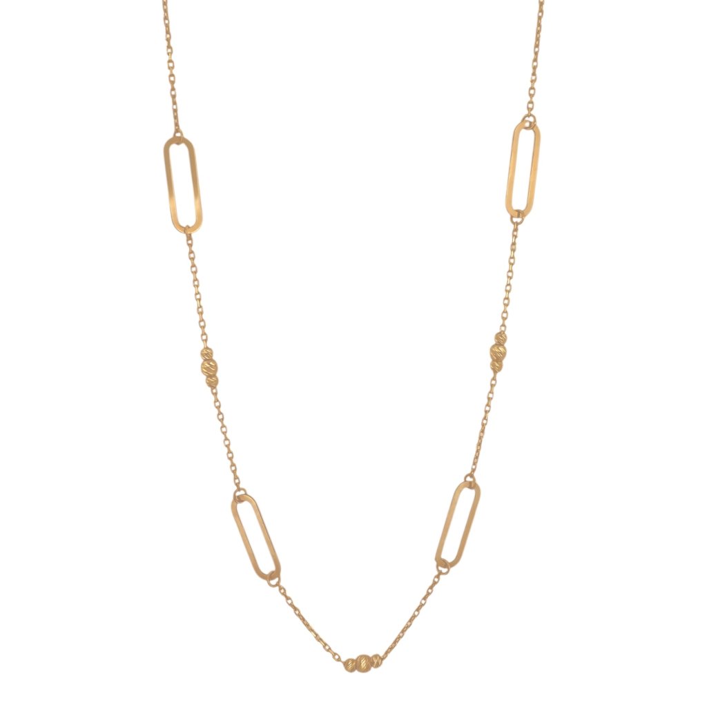 Tento jemný zlatý náhrdelník s oválnými články a kuličkami představuje harmonické spojení elegance a světelných akcentů.