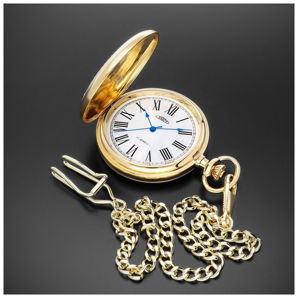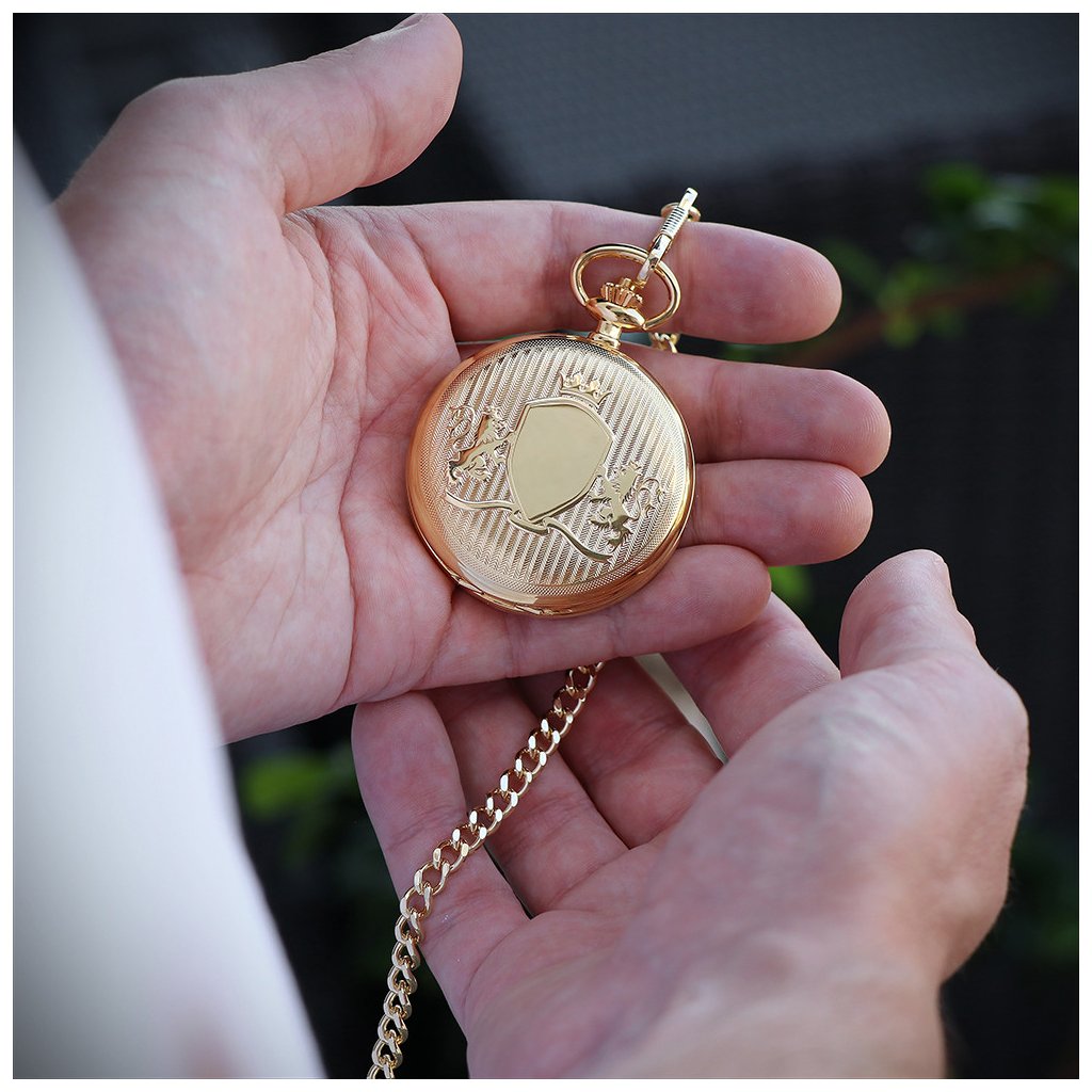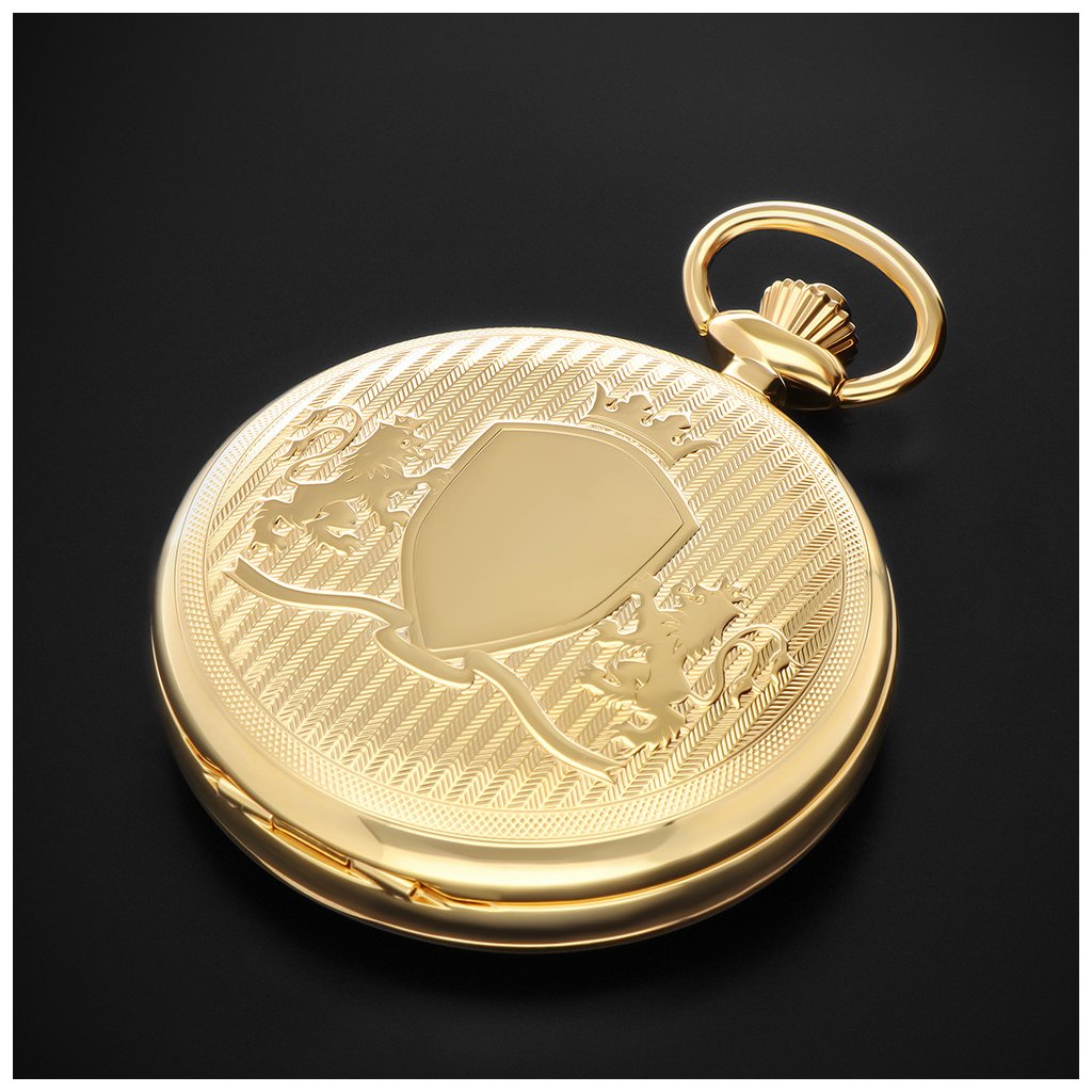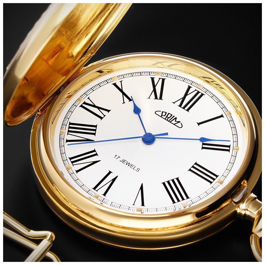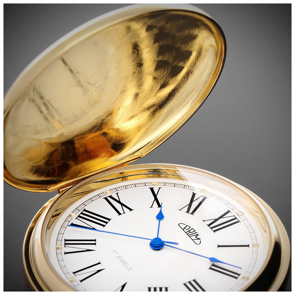 Klasické mechanické kapesní hodinky PRIM s ručním nátahem s římskymi číslicemi. Nově navržený plášť hodinek zdobí symbol českého znaku, tedy dvouocasý lev doplněný erbem, který se perfektně hodí k individualizaci monogramu. Hodinky jsou dodávány s nerezovým řetízkem.
