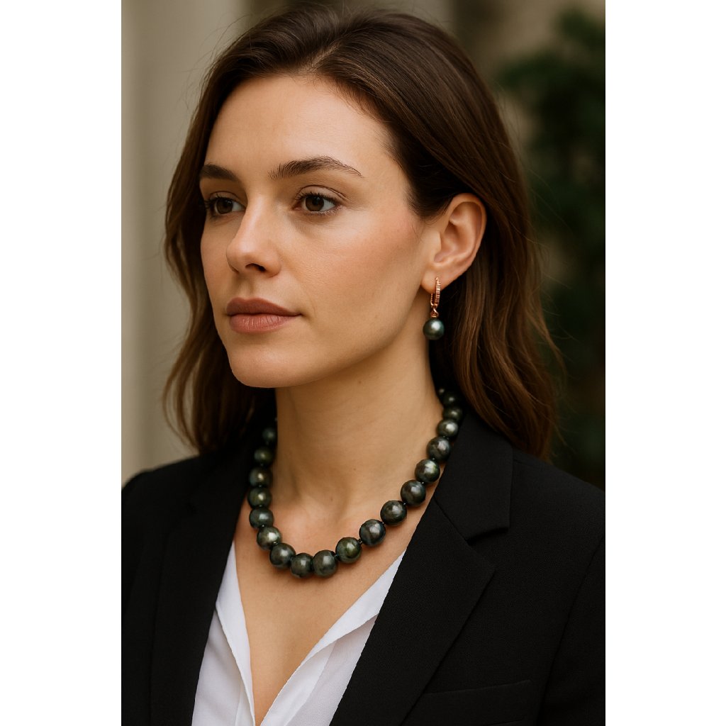 Tento luxusní perlový náhrdelník s tahitskými černými perlami je skvostem mezi šperky. Tahitské perly o průměru 11–12 mm září tmavým leskem a mají unikátní odstíny, od černé po jemně zelenou či modrou.
