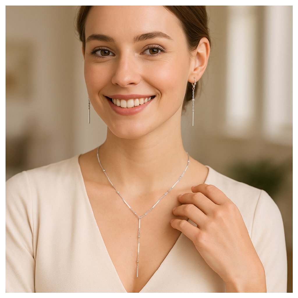 Náhrdelník je vyroben z rhodiovaného stříbra ryzosti 925/1000, které zaručuje dlouhotrvající lesk a odolnost proti oxidaci. Tento materiál poskytuje elegantní povrch, který si zachovává svou svěžest i při častém nošení. Dlouhý visící prvek navíc působí jemně a lehce, čímž zvyšuje pohodlí nošení po celý den.