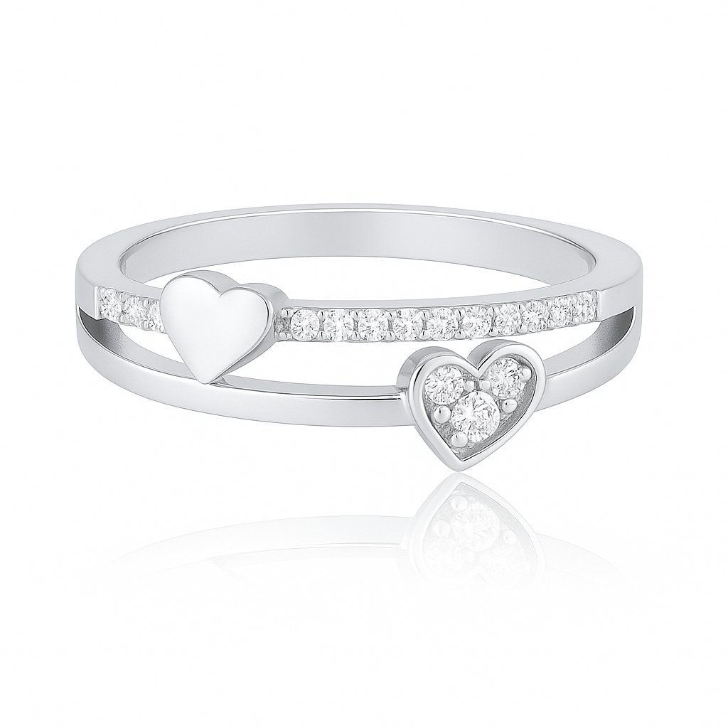 Prsten okouzlí svým jemným a zároveň moderním designem. Obroučka je zdobená třpytivými zirkony zasazenými v linii, které dodávají prstenu oslnivý lesk. Dva motivy srdíček – jedno hladké a druhé osazené kamínky – symbolizují lásku a něžnost.