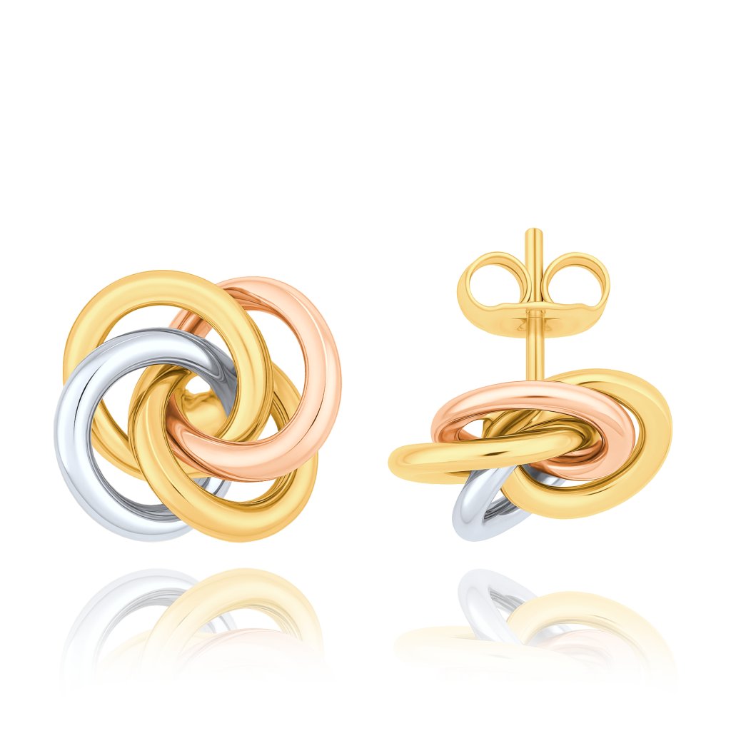 Elegantní trojbarevné náušnice MINET z 14k zlata v designu uzlíku. Spojení žlutého, bílého a růžového zlata v nadčasovém stylu pro každou příležitost.