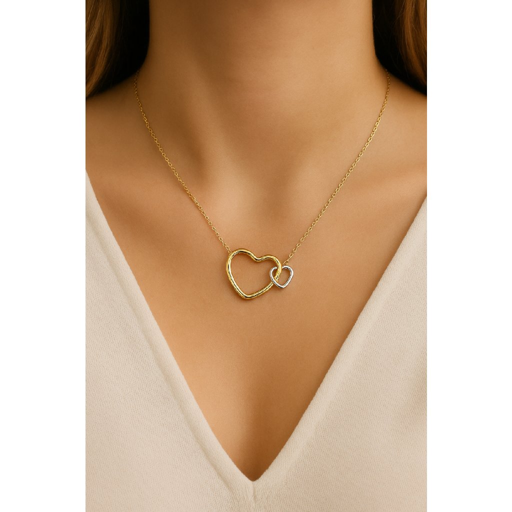 Oživte svůj styl romantickým detailem — tento náhrdelník s pohyblivým srdcem ze dvou tónů zlata přitahuje pozornost jemným pohybem srdíčka, které se při každém pohybu jemně kývá.