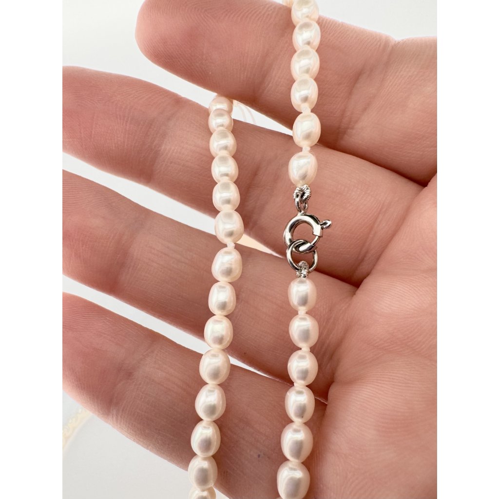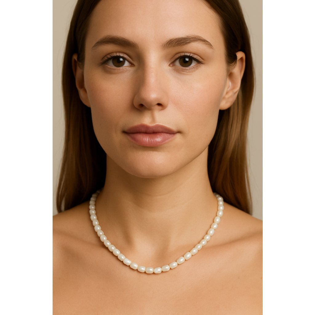 Tento náhrdelník je vyroben z drobných sladkovodních říčních perel, které vynikají svým jemným leskem a přirozenou krásou. Perly jsou precizně vybrány pro jednotný tvar a velikost, což zajišťuje harmonický a elegantní vzhled. Díky své jednoduchosti se skvěle hodí jako doplněk k jakémukoli outfitu, ať už do práce, na společenské události nebo na svatby.