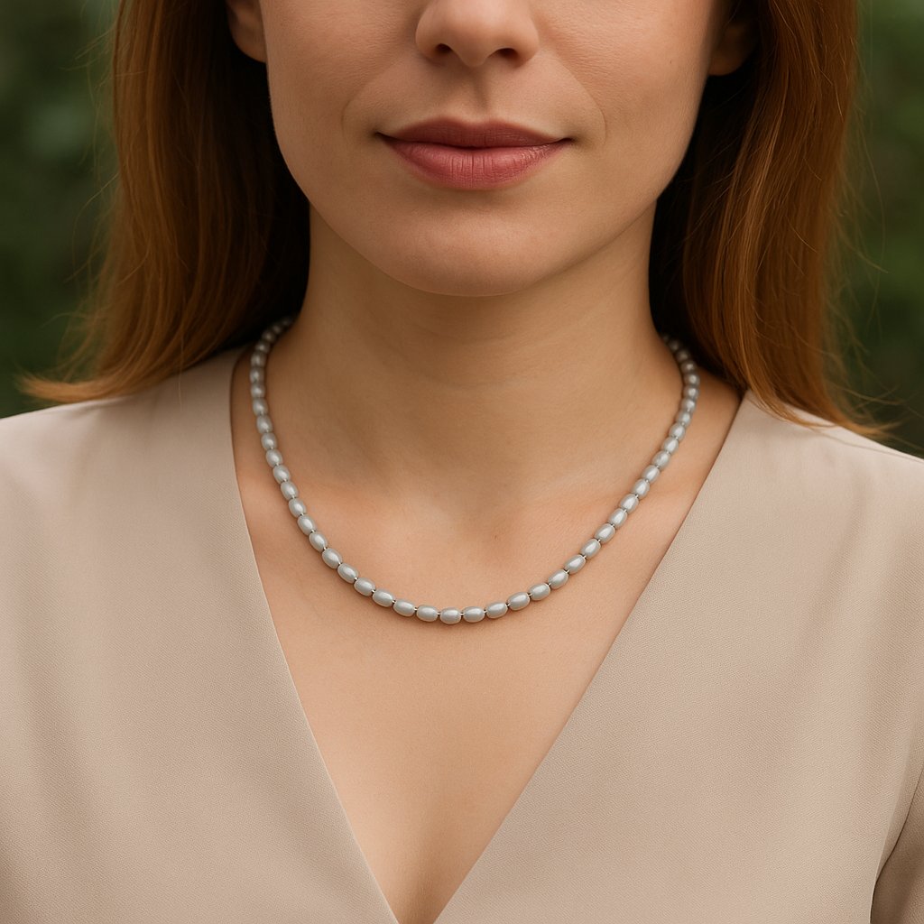 Náhrdelník je složen z kvalitních sladkovodních říčních perel, které mají přirozený lesk a elegantní šedou barvu. Šedé perly představují moderní variantu klasických perlových šperků, přičemž si zachovávají všechny typické vlastnosti – hladký povrch, lesk a jemnost.