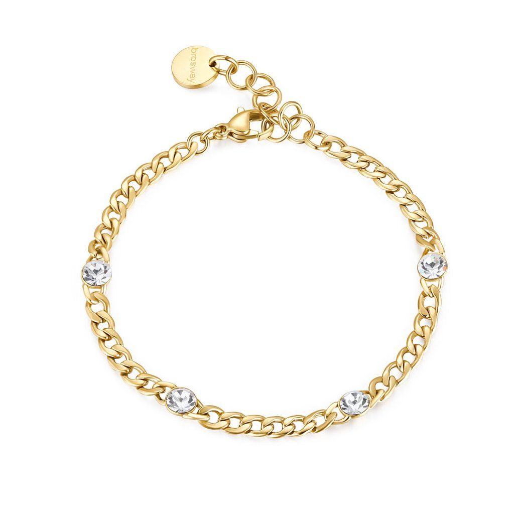 rásný náramek značky Brosway je elegantní šperk určený pro ženy, který kombinuje moderní design s kvalitními materiály , vyrobený z chirurgické oceli 316L, je odolný a hypoalergenní , potažený zlatým PVD povlakem , zdobený třpytivými čirými krystaly dodává jemný a sofistikovaný vzhled , ideální pro každodenní nošení , tento náramek je skvělým doplňkem pro každou příležitost . Dodáváme v originální krabičce značky Brosway.