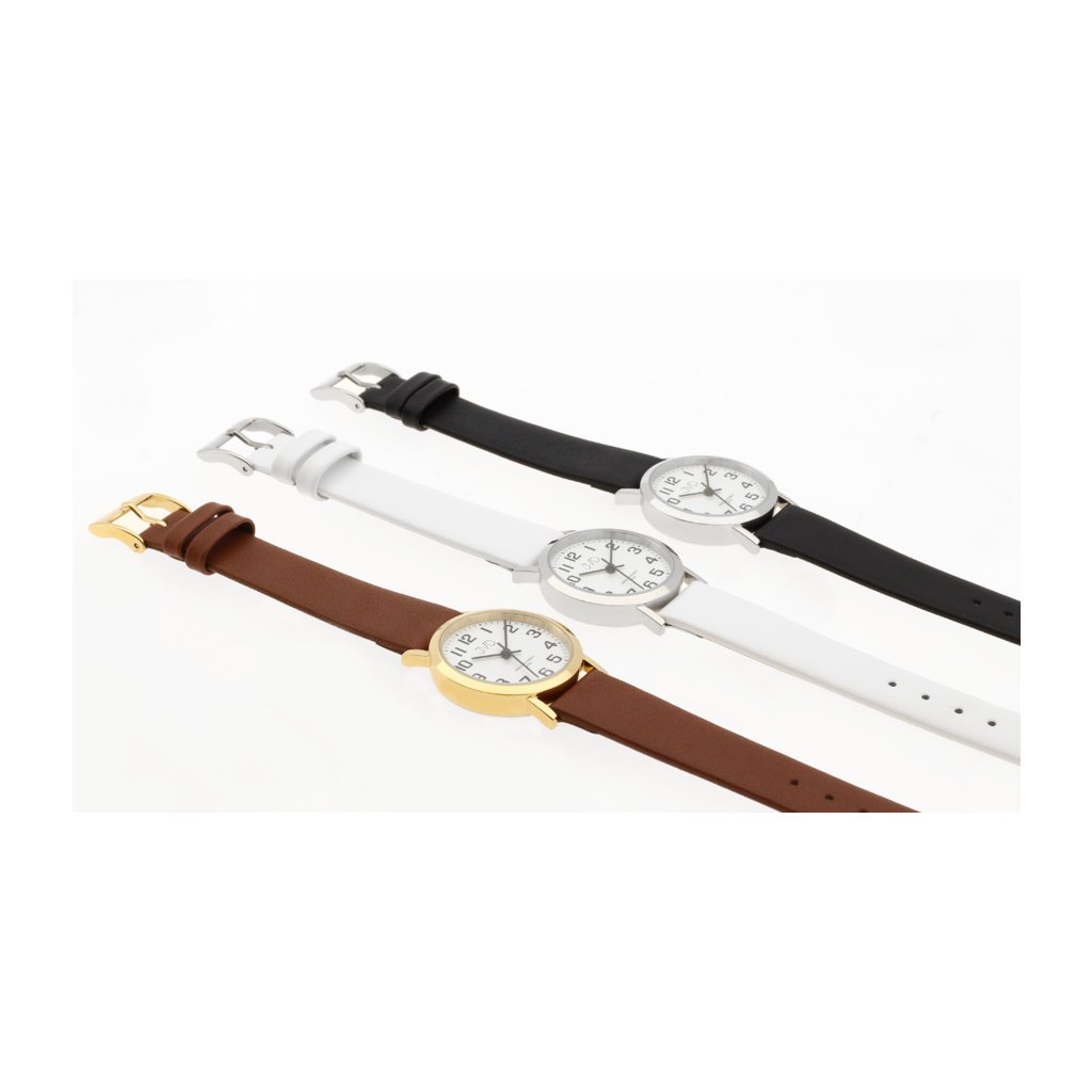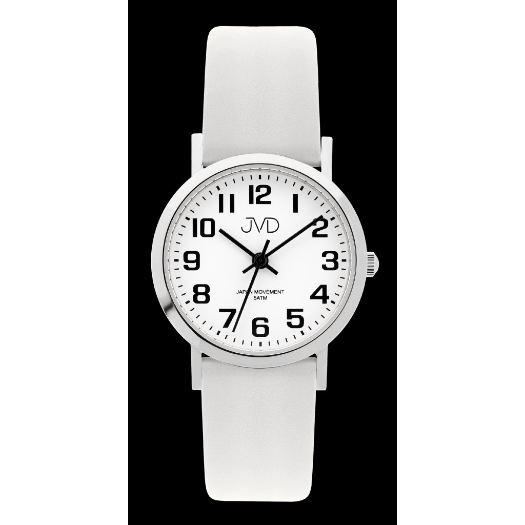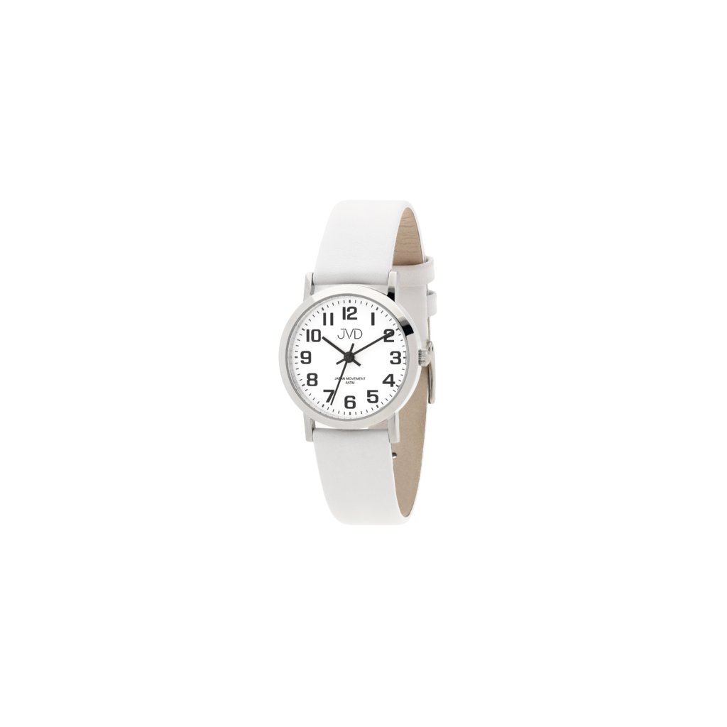 Dámské společenské náramkové hodinky JVD s koženým bílým řemínkem.