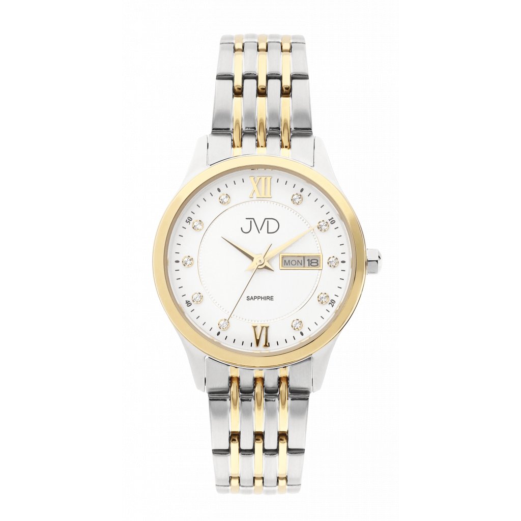 Dámské elegantní kvalitní hodinky v bicoloru se safírovým sklíčkem na kovovém řemínku, ciferník zdobené kamínky.Den v týdnu, datum.