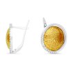 Luxusní náušnice v kombinaci bílého a žlutého zlata zdobené jemnými zirkony po obvodu. Žlutá zlatá plocha je zmatněná s elegantními průhyby, což dodává náušnicím moderní vzhled. Jsou pohodlné na nošení a ideální jako součást sady se stejným designem (přívěsek, prsten).