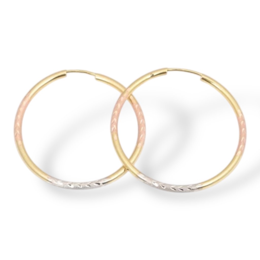 Elegantní náušnice z kombinovaného zlata tvoří klasické kruhy bez dalších zdobení. Design se skládá ze tří odstínů – žlutého, bílého a růžového zlata, které se střídají po celé délce náušnice a vytvářejí moderní a nadčasový vzhled.