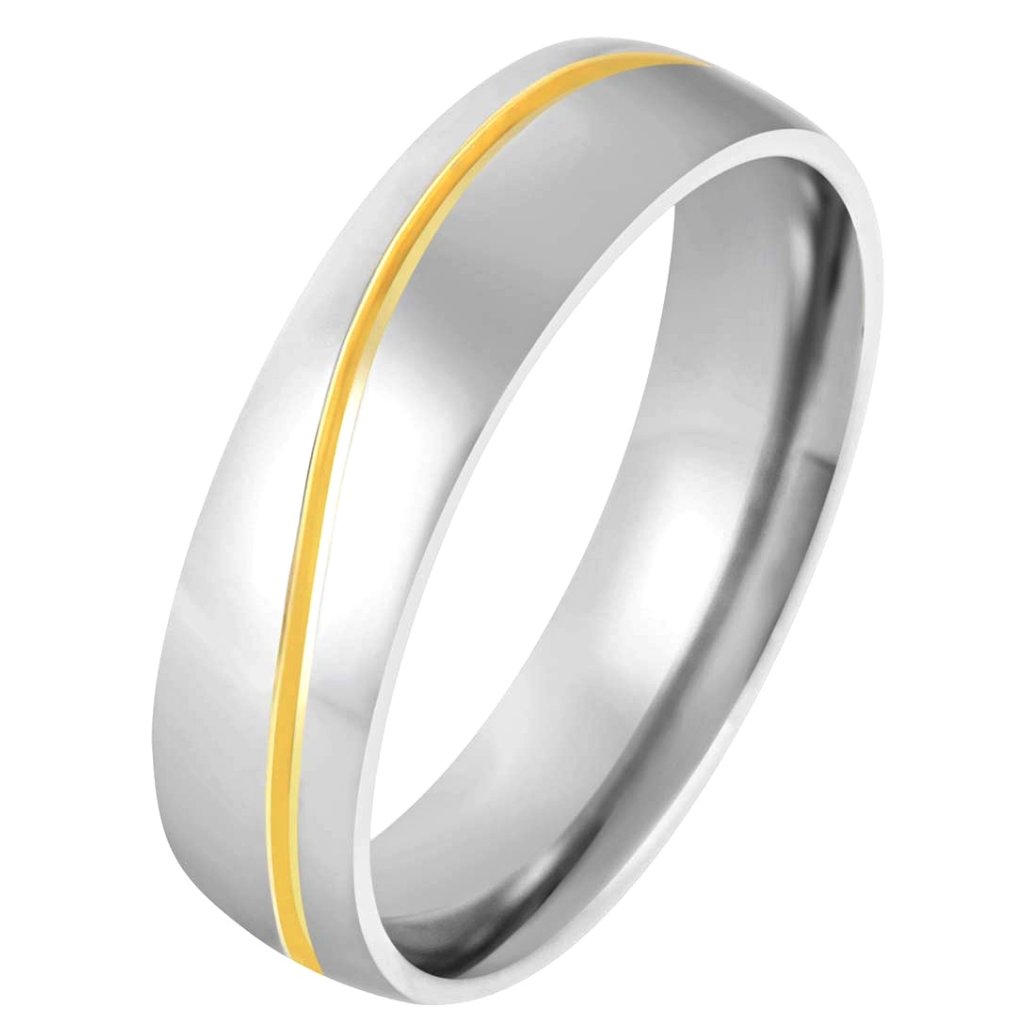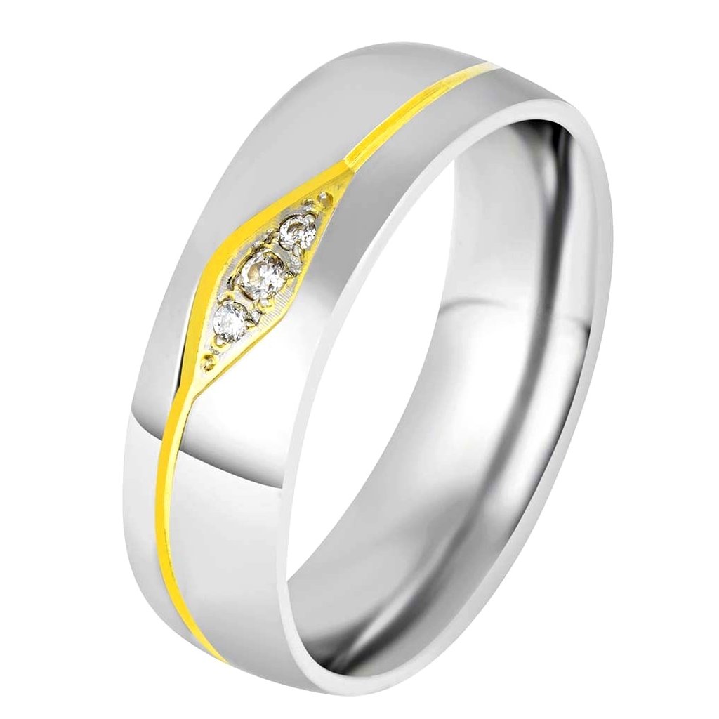 Dámský ocelový snubní prsten s jemnou vlnkou žlutého zlata v šířce 6mm. Pro zvýraznění tři kameny, které symbolizují minulost, současnost a budoucnost. Nabízíme modely od velikosti 48-60 vždy sudé číslo. Rytina je možná dle požadavku do týdne od uhrazení objednávky. Pánský model 240305 je bez kamenů.
