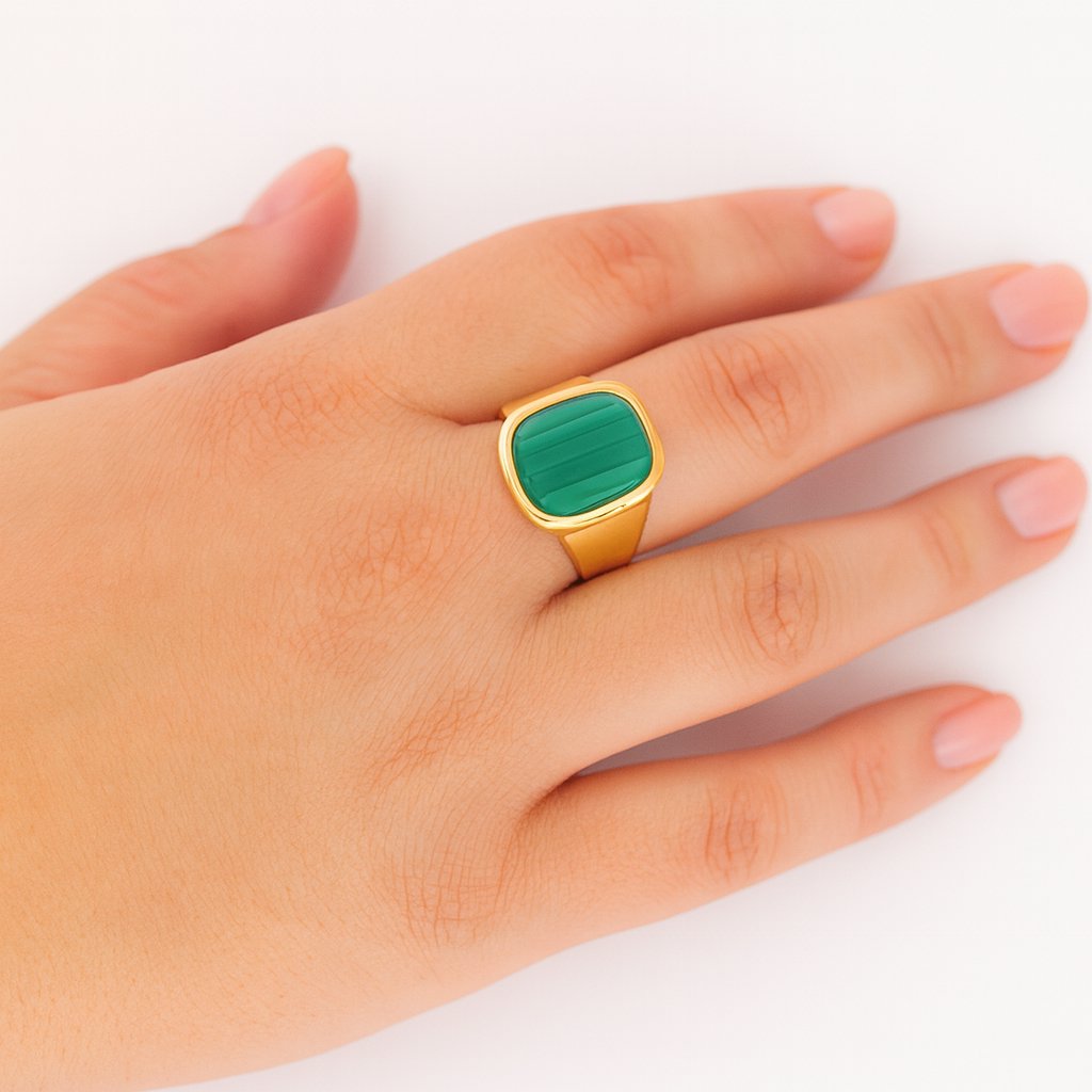 Srdcem prstenu je nádherný malachit, který se pyšní svými charakteristickými zelenými pruhy a hlubokým leskem. Malachit je pečlivě zasazen do zlatého rámu, což zvýrazňuje jeho krásu a zajišťuje jeho stabilitu.