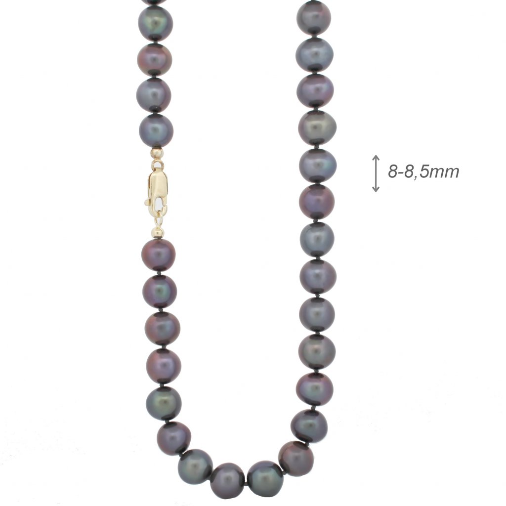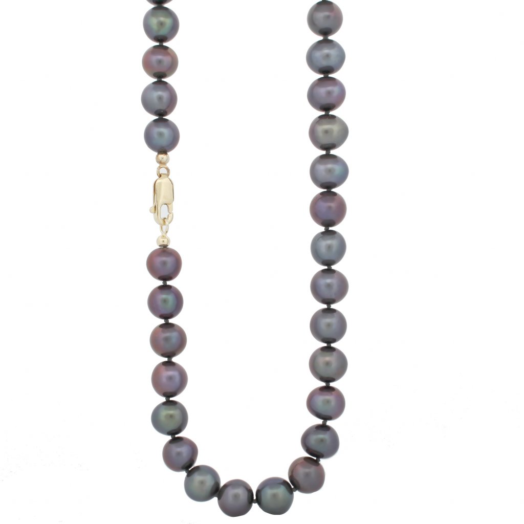 Nádherný náhrdelník s tmavými perlami je tvořen z okouzlujících velmi kvalitních sladkovodních perel krásné tmavě duhové barvy s kovovým nádechem a sametově hladkým povrchem. Lesk těchto perel je hluboký, působí elegantně a tajemně. Perly jsou ručně navlečené na hedvábné šňůrce s použitým zapínáním v podobě velmi pěkné karabiny, což splňuje předpoklad bezpečného a příjemného nošení.