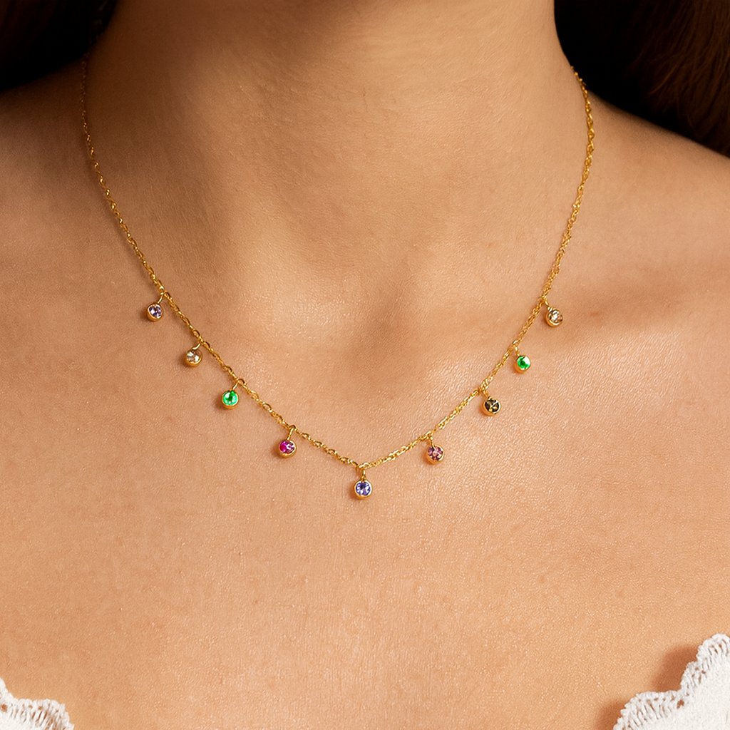 Tento náhrdelník je perfektní volbou, pokud chceš doplněk, který přidá barevný prvek ke stylu bez přehánění. Hodí se pro společenské akce, narozeniny, rodinné oslavy nebo jako výrazný detail k elegantnímu outfitu. Barevné zirkony mu dovolí ladit s různými barvami oblečení, takže je flexibilní volbou.