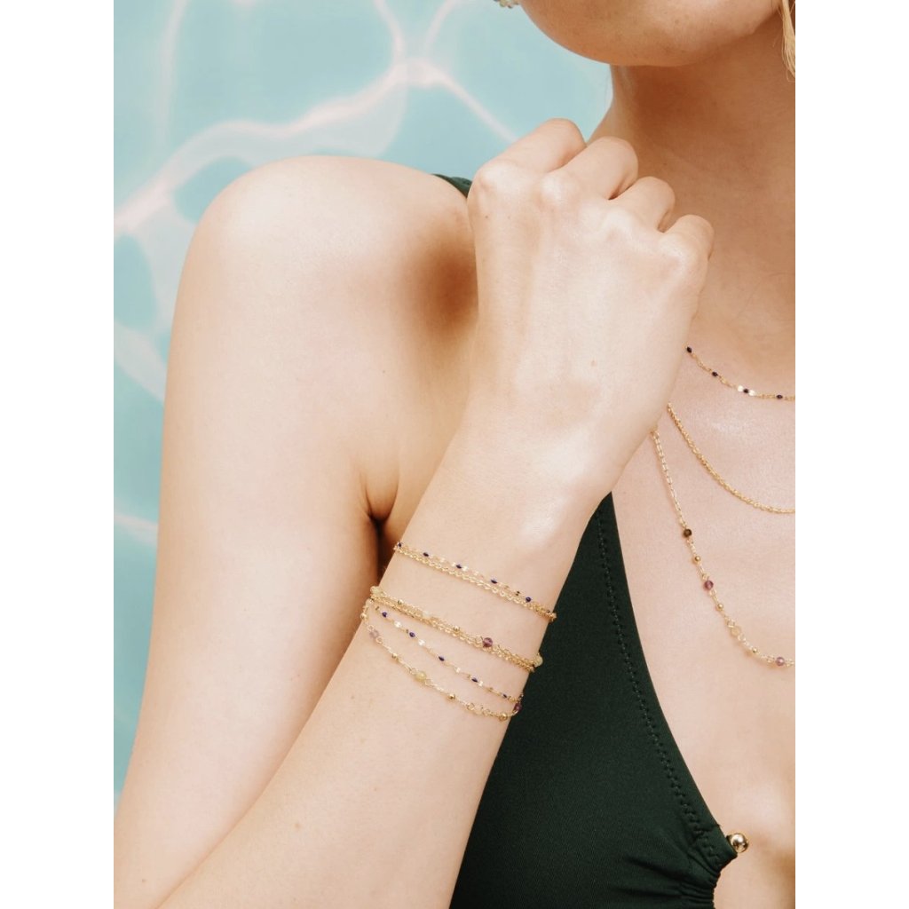 Design kombinuje zdánlivou lehkost s výrazným třpytem — kamínky v odstínech modré, zelené, růžové, žluté dodávají náramku živost, zatímco pozlacení mu propůjčuje teplý, zlatavý nádech. Tento stylový doplněk funguje jak samostatně, tak v kombinaci s dalšími šperky.