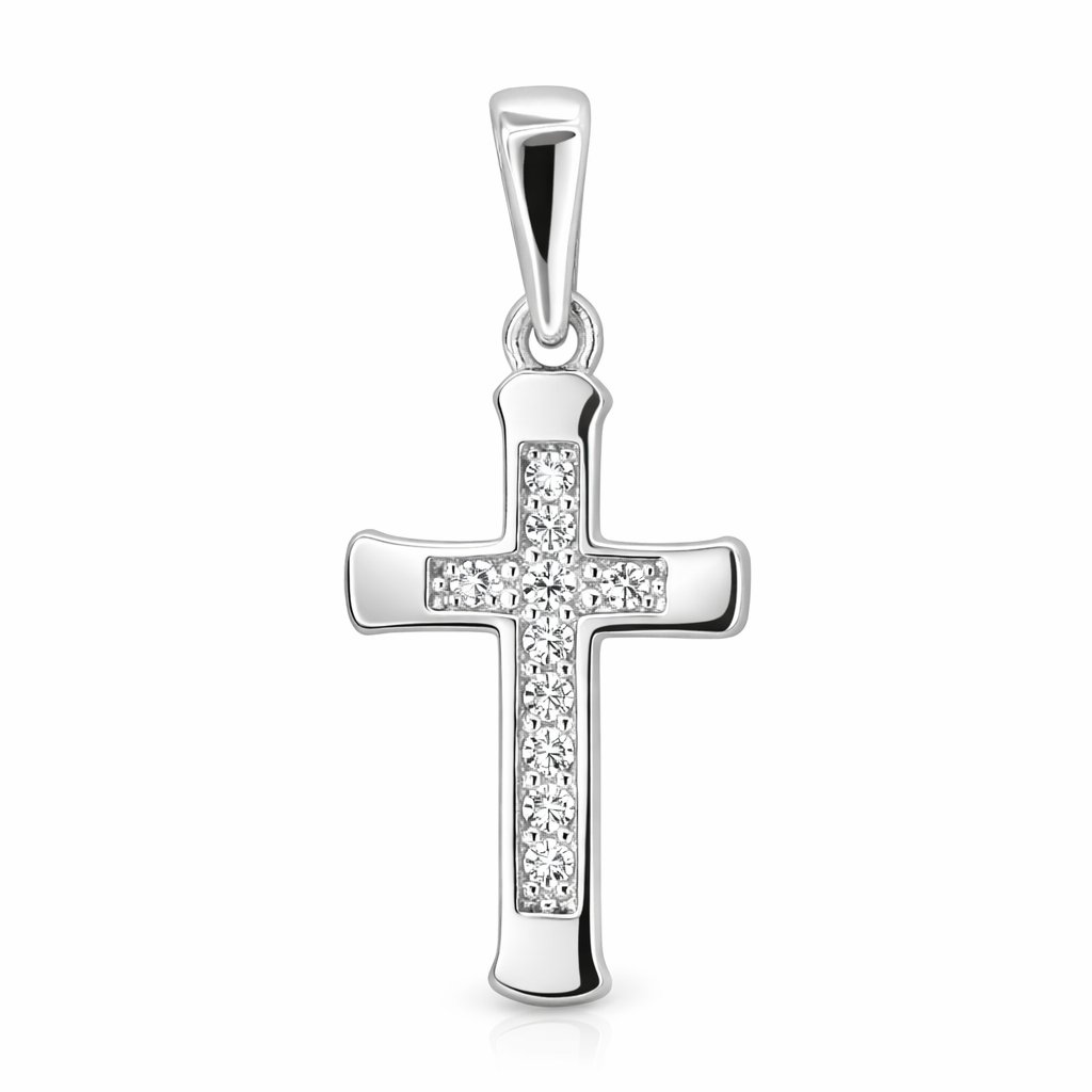 Tento elegantní přívěsek ve tvaru kříže je vyroben z bílého zlata ryzosti 585/1000 (14 karátů), zdobený drobnými čirými zirkony ve vrchní části.