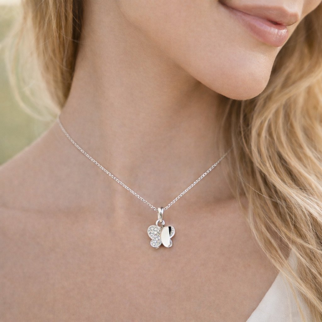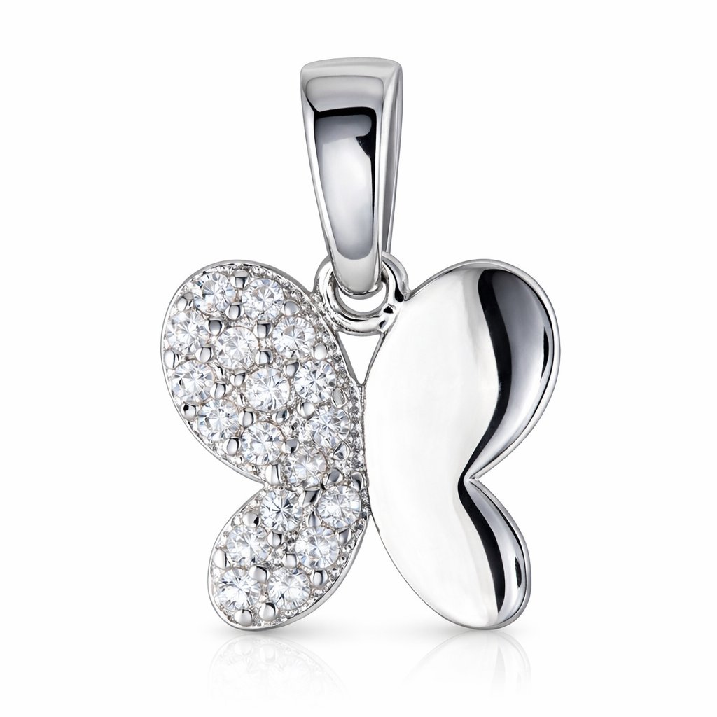 Hlavním prvkem přívěsku je motýlí silueta vyrobená z bílého zlata ryzosti 585/1000 (14 kt), která je částečně zdobena broušenými zirkony. Zirkony jsou broušené kamínky s vysokým odrazem světla, díky kterému vytvářejí nádherný třpyt podobný diamantům, ale za příznivější cenu. Celkový efekt je jemný a přitom výrazný — přívěsek působí lehce a sofistikovaně, takže se skvěle hodí jak k dennímu nošení, tak i ke slavnostnějším outfitům.