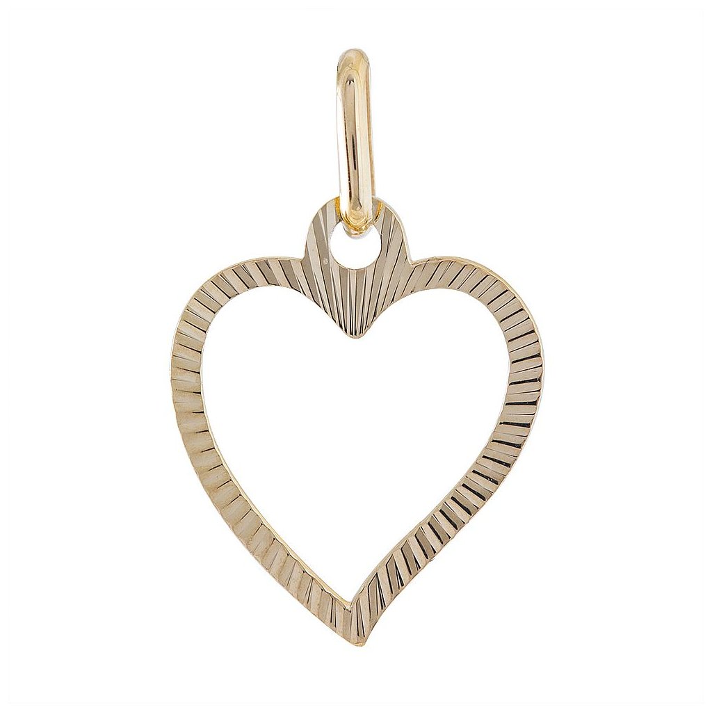 Tento šperk reprezentuje tradiční motiv srdce, který vyjadřuje city, lásku a blízké vazby. Povrch přívěsku je celogravírovaný, což znamená, že zlato je po celém povrchu zdobeno rytými linkami či vzory — gravírování je technika, při které se do kovu vyrývají motivy nebo detaily pomocí laseru či jiných nástrojů, a dodává šperku texturu, hloubku a osobitý charakter. Celé provedení tak působí velmi jemně a přitom výrazně.