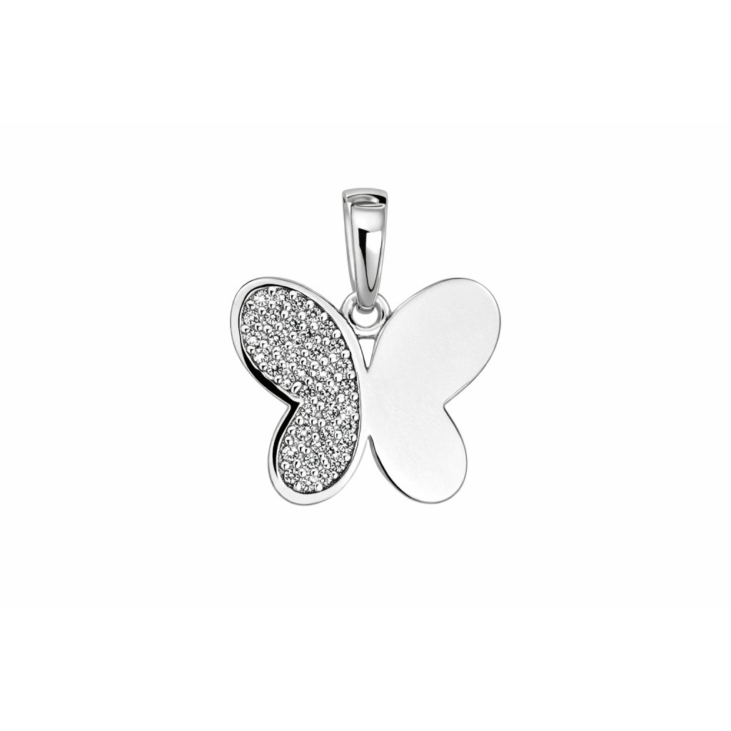 Přívěsek z bílého zlata ve tvaru motýla se zirkony zaujme jemným a něžným designem inspirovaným letící přírodou.