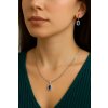 Šperk je vyroben z bílého zlata ryzosti 585/1000 (14 karátů), které díky svému chladně stříbřitě lesklému vzhledu skvěle vynikne na pleti a ladí s ostatními bílými kovy. Modrý hranatý kámen (např. safír, topaz či modrý zirkon – přesný druh kamene doporučujeme ověřit u prodejce) je zasazen v decentním rámečku tak, aby byl kámen v centru pozornosti. Zapínání a úchyt přívěsku jsou provedeny tak, aby byl komfort nošení vysoký a šperk bezpečně zavěšen na řetízek.