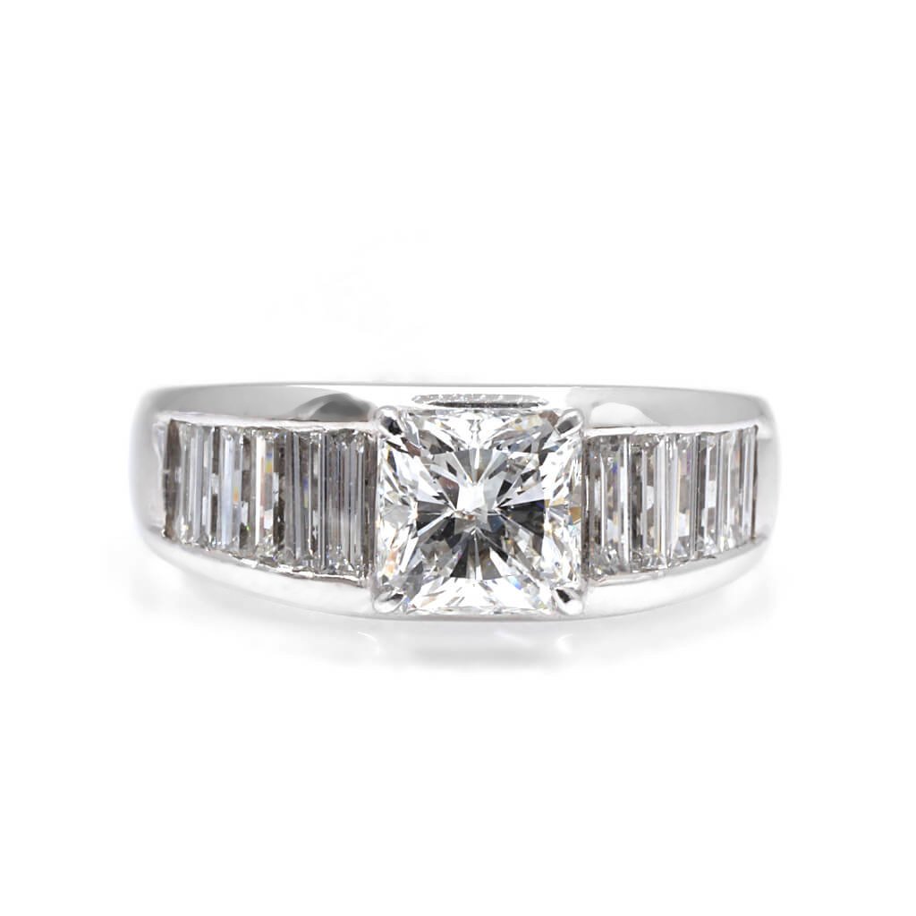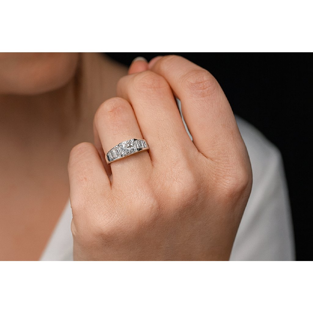Prsten je vyroben z bílého zlata Au 585/1000 (14 karátů), které je často opatřeno rhodiovou úpravou pro zvýšení odolnosti proti opotřebení a lesku. Šperk je osazen několika hranatými diamanty, jejichž celková váha dosahuje 0,85 ct — tento typ výbrusu dodává na ostrosti kontur a upoutá pozornost. Kov i osazení jsou precizně leštěné pro zachování dokonalého vzhledu.