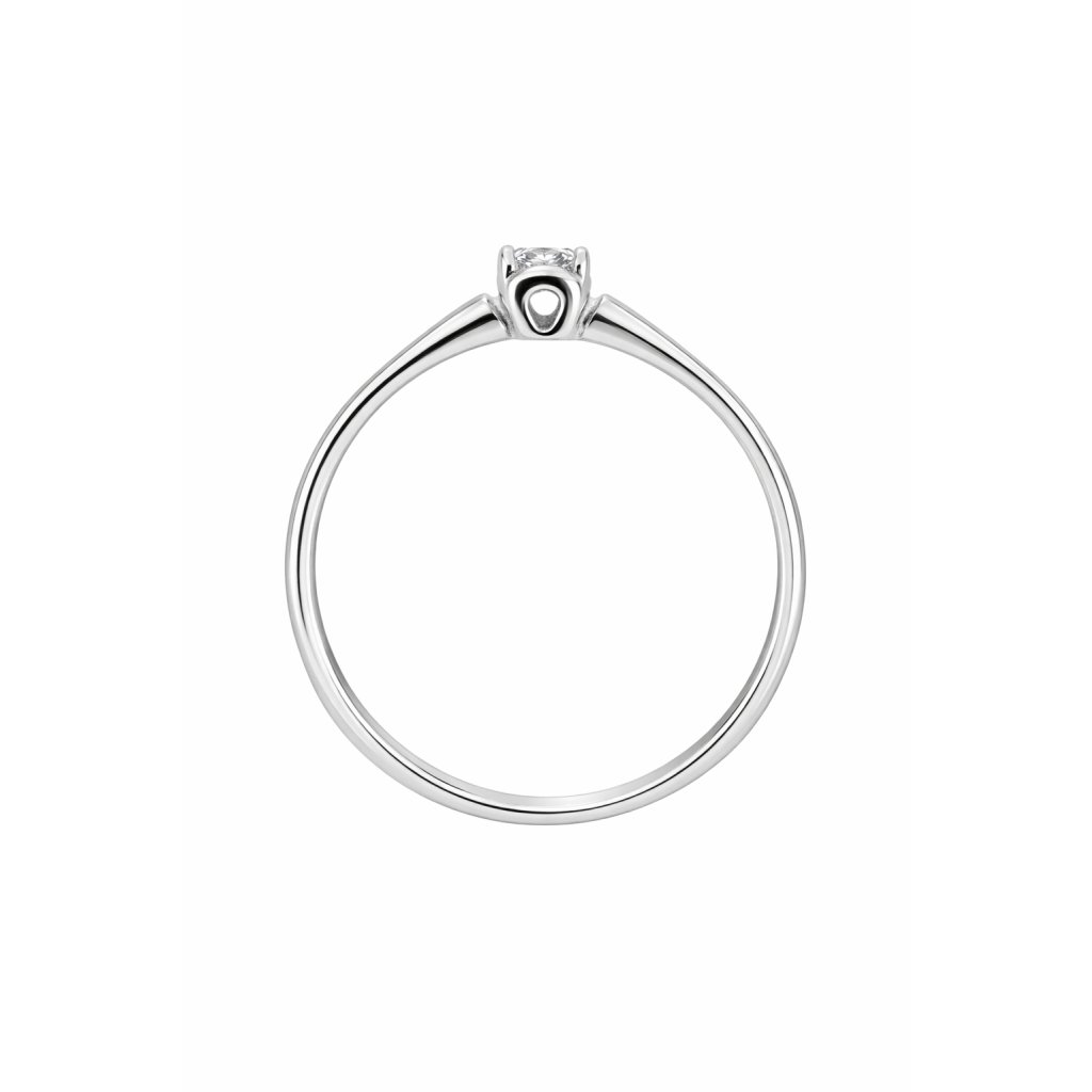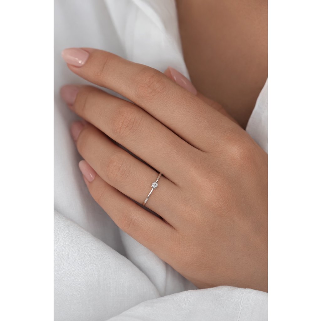 Dominantou prstenu je drobný čirý zirkon, který je zasazen tak, aby krásně odrážel světlo. Jednoduchá obroučka z bílého zlata nechává vyniknout samotnému kameni jako hlavnímu prvku šperku. Díky minimalistickému provedení se prsten snadno kombinuje s dalšími šperky i různými outfity.