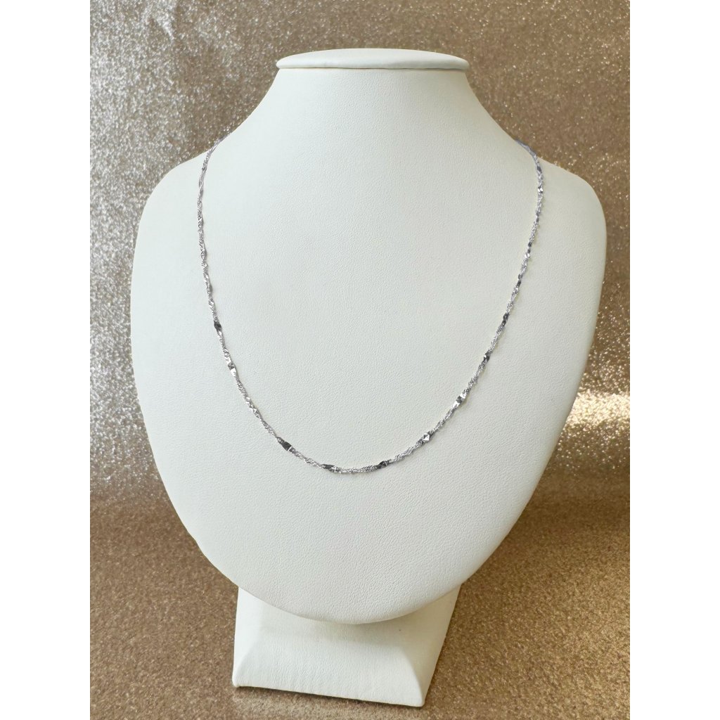 Řetízek je vyrobený z bílého zlata, které je známé pro svůj stříbřitý odstín a moderní vzhled. Bílé zlato je oblíbenou volbou díky své odolnosti, trvanlivosti a schopnosti kombinovat se s dalšími šperky z různých kovů.
