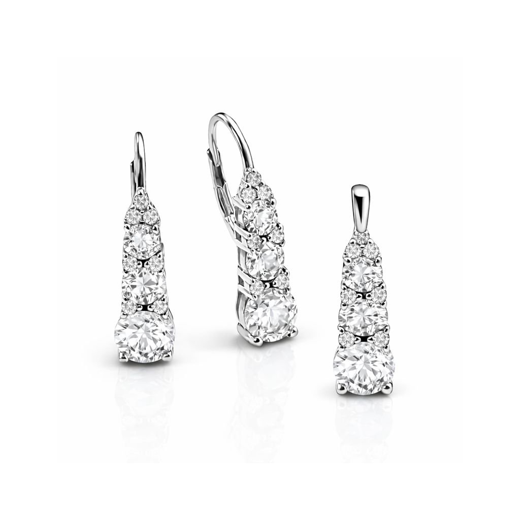 Souprava se skládá z stříbrných náušnic a přívěsku, které jsou ozdobeny precizně broušenými bílými kamínky (např. kubickou zirkonií), jež intenzivně odrážejí světlo a vytvářejí efektní třpyt podobný diamantům. Lesklé kamínky v kombinaci s chladivým leskem stříbra působí esteticky čistě a elegantně. Design je univerzální a nadčasový, takže set krásně doplní jakýkoliv outfit — od denního až po večerní look.