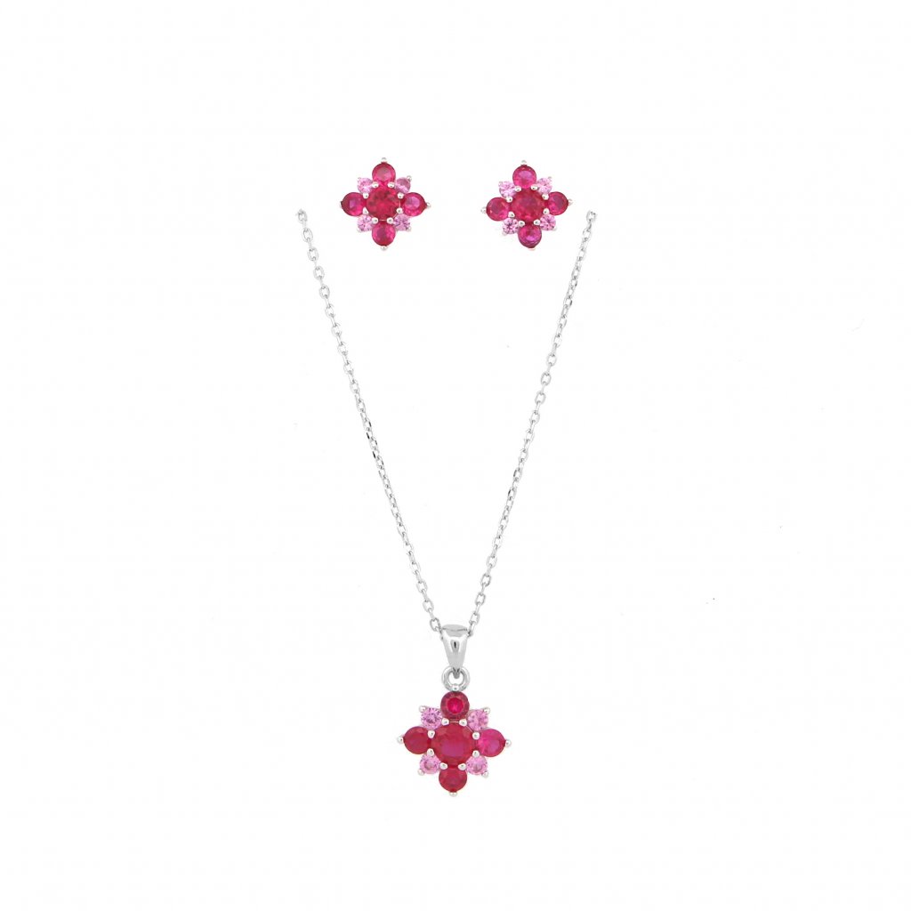 Souprava je vyrobena z kvalitního stříbra, které je známé svou odolností a krásným leskem. Růžové prvky jsou tvořeny syntetickými kameny, které jsou pečlivě zasazeny do stříbrného základu, což zajišťuje jejich pevné uchycení a trvanlivost.