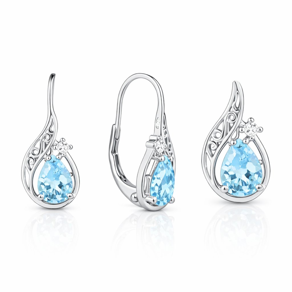 Elegantní stříbrná souprava světle modrá je harmonicky sladěný set šperků, který kombinuje náušnice a přívěsek ve stejném motivu světle modrých kamínků.
