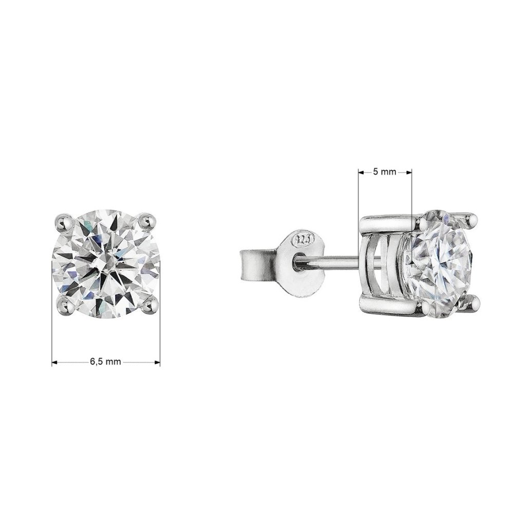 Náušnice jsou vyrobeny ze stříbra 925/1000, opatřené rhodiovou úpravou, která zajišťuje trvalý lesk a chrání před oxidací. Jsou osazeny Moissanity kameny, které svým vzhledem a třpytem připomínají diamanty, ale za přívětivější cenu. Upevnění typu puzeta zajišťuje pohodlné nošení i během dne.