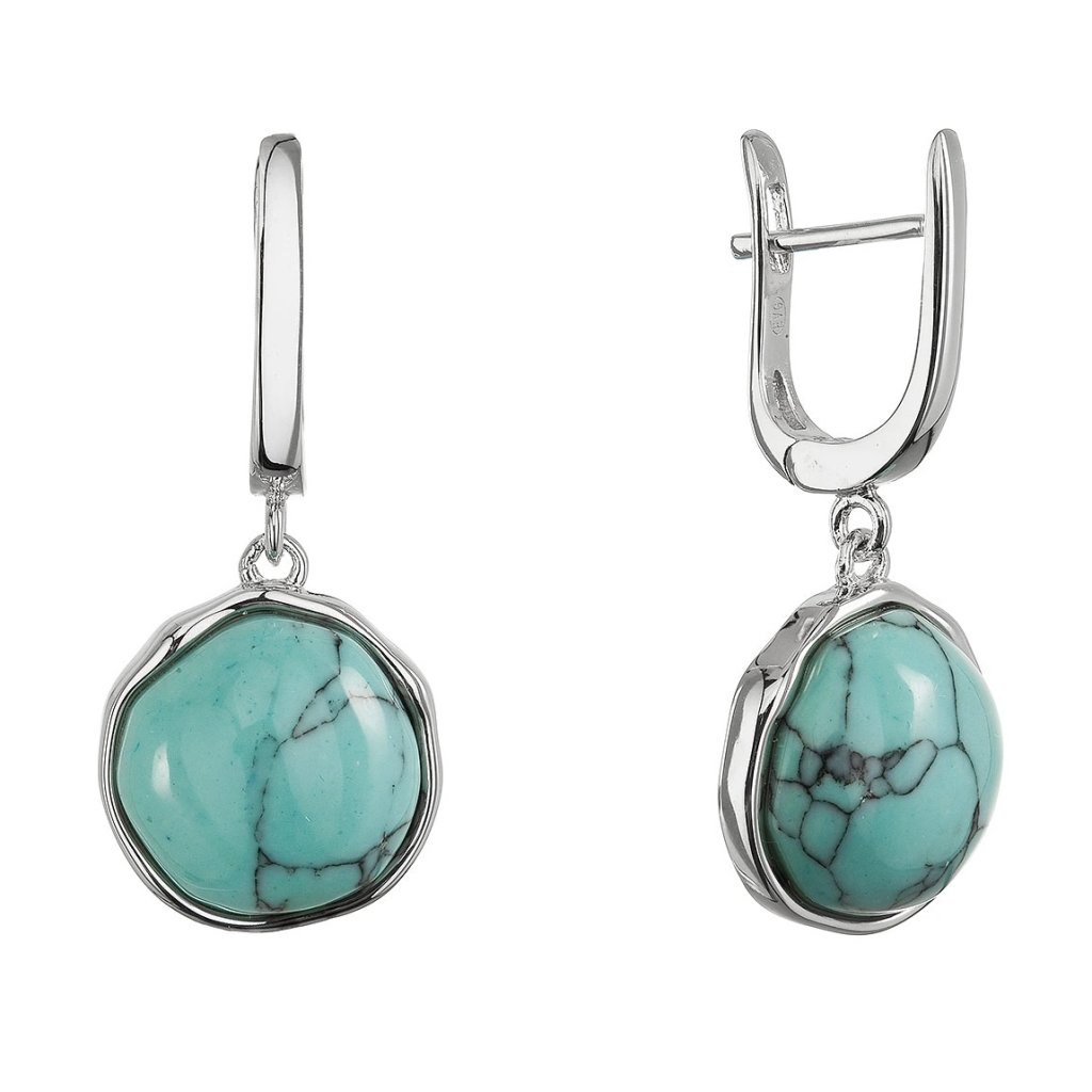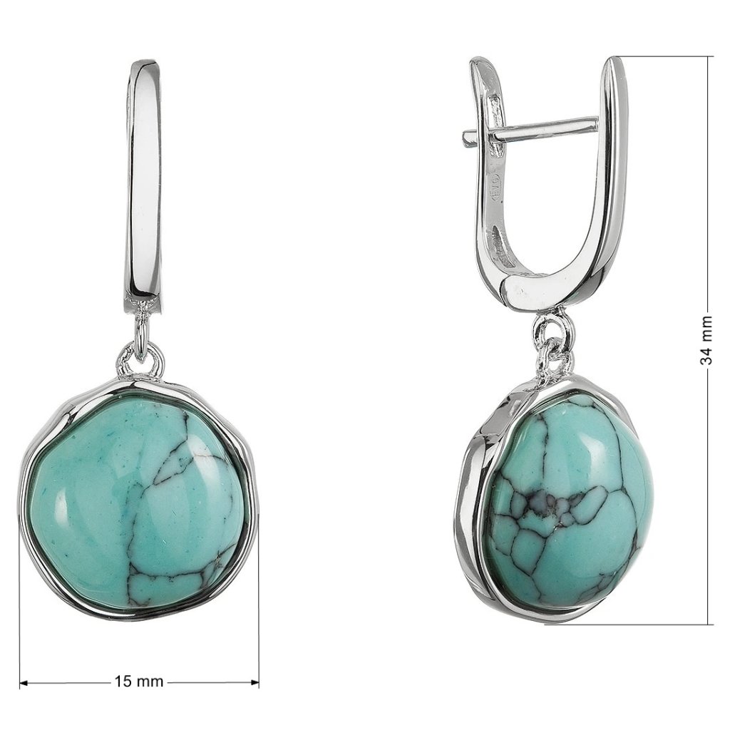 Tyto stříbrné visací náušnice s tyrkysem zaujmou kombinací decentního kovu a přírodního kamene. Jemný visací design dovoluje, aby tyrkys volně vynikl při pohybu, přidávající šperku živost a eleganci.