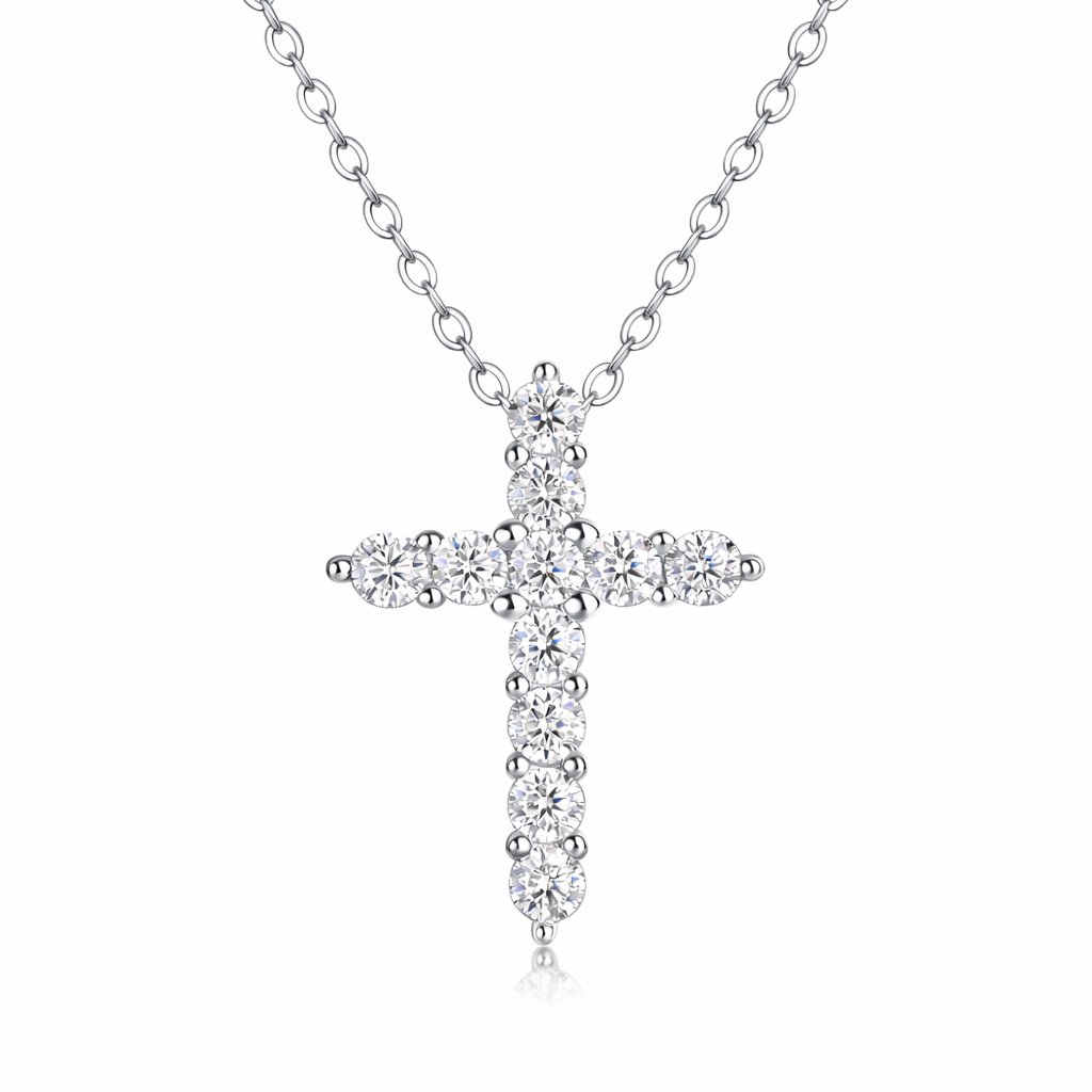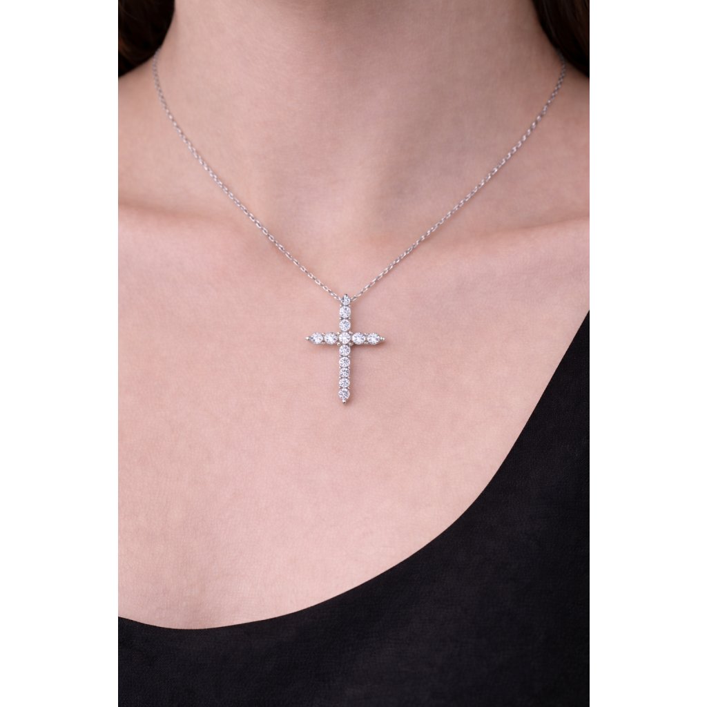Elegantní stříbrný náhrdelník – celokamenový křížek s moissanity je minimalistický a přitom výrazný šperk, který spojuje klasický symbol víry s moderním třpytem drahokamů.