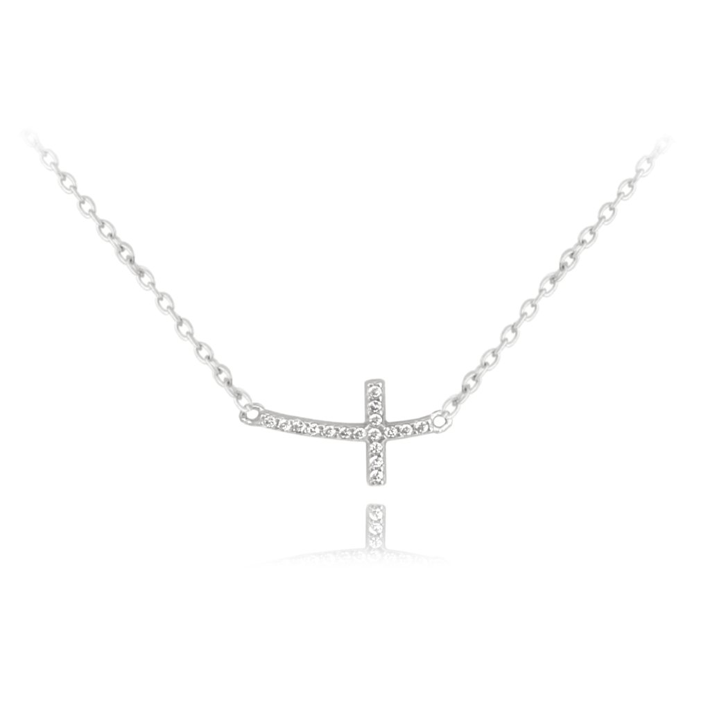 Stříbrný náhrdelník s drobným křížkem zdobený zirkony je jemným šperkem s elegantním a nadčasovým designem.