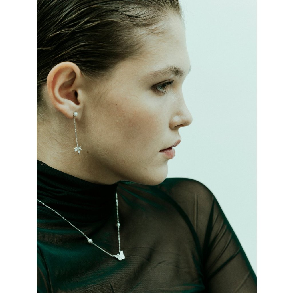 Náhrdelník je vyroben z rhodiovaného stříbra s ryzostí 925/1000, které zajišťuje dlouhodobý lesk a ochranu proti oxidaci. Na stříbrném přívěsku je vsazena kubická zirkonie Preciosa a řetízek doplňují drobné pravé říční perly, jejichž přirozená variabilita podtrhuje originalitu každého kusu. Délka řetízku je čtyřicet centimetrů s možností prodloužení o sedm centimetrů pro pohodlné přizpůsobení hloubce výstřihu a rozměry motýla jsou sedmnáct na jedenáct milimetrů.