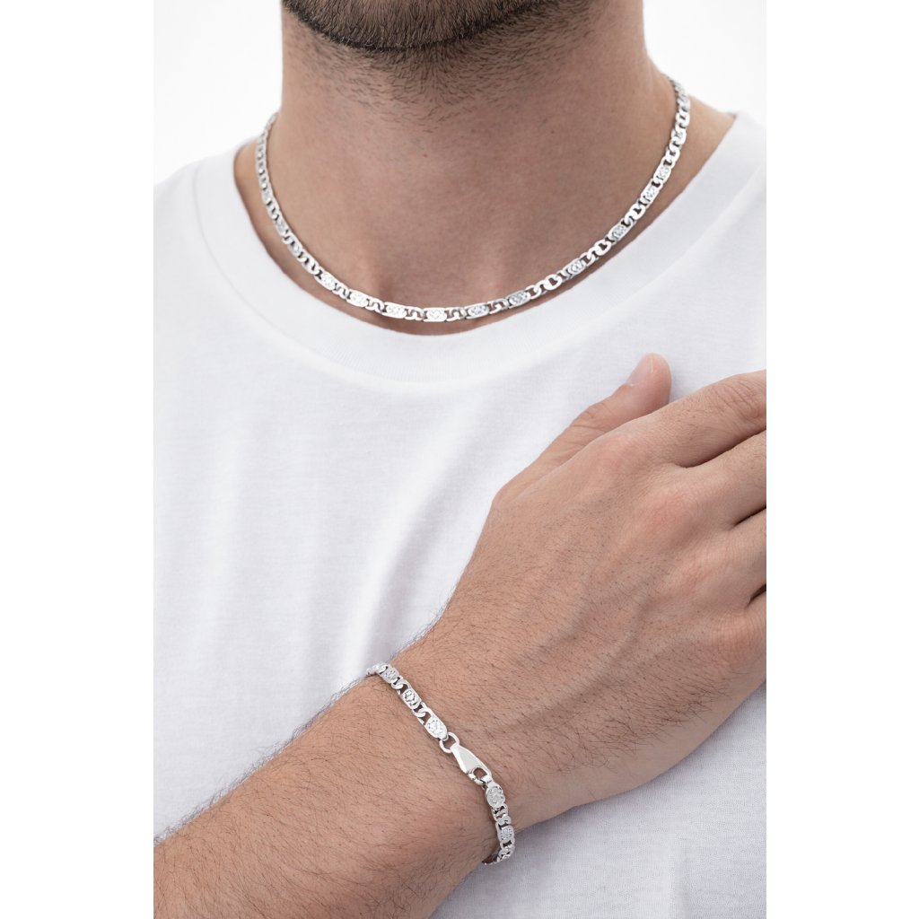 Náramek tvoří pevné pancer můstkové články doplněné jemným gravírováním, které krásně odráží světlo. Gravírované detaily dodávají šperku hloubku a vizuální zajímavost. Díky kvalitní konstrukci se náramek pohodlně nosí a krásně sedí na ruce.