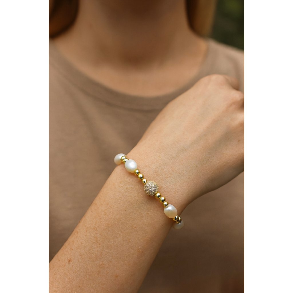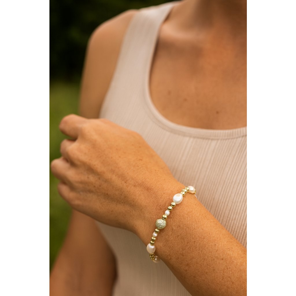 Stříbrný pružný náramek v jemném provedení spojuje několik perel s drobnými kuličkami, čímž vzbuzuje dojem lehkosti a nadčasové elegance. Jemná pružnost zajišťuje pohodlné nošení a snadné přizpůsobení zápěstí, což podtrhuje neformální, ale přesto stylový charakter.
